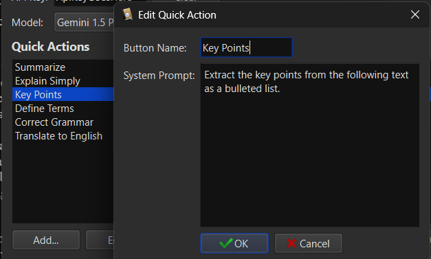 As a long-time user, I admire and appreciate the continuous effort that has made Calibre the indispensable application it is today. My sincere gratitude to all involved. My gratitude aside, now a reflection on the reading experience (that many may be able to attest to). Through countless hours of reading, I've often found myself pausing, grappling with questions a page (or pages) alone cannot answer. Such unanswered questions frequently necessitates reaching for external tools - be it search engines or, increasingly, Large Language Models (LLMs) like ChatGPT - to bring the reader (me) to deeper comprehension. Think extracting the logical structure from an argument in Spinoza's Ethics or identifying experimental findings from a highly technical paper in Science magazine -- sure, one can meticulously re-read, cross-reference, and manually outline these works, to eventually get to the "answers," but an LLM offers that which traditional tools cannot provide: an immediate, context-aware synthesis, one that drastically reduces the cognitive overhead and time spent in the pursuit of genuine understanding; after all, effort saved is focus gained. To expand briefly on the point: unlike static resources that provide isolated facts or definitions (e.g., search engines or dictionaries), LLMs can take a paragraph or passage as complex as Kant's Critique of Pure Reason or as dense as a molecular biology research paper from Nature and instead synthesize its core ideas, explain complex relationships, or rephrase it into simpler term -- and all while retaining important context. It has led me to a realization that I have finally decided to act upon: while having a separate LLM window (ChatGPT, Claude, Grok, Gemini, etc.,) works, imagine the metamorphic potential if this capability were integrated directly into the Calibre application itself. With that vision, I have developed and tested a new feature that integrates Google's Gemini API (which can be abstracted to any compatible LLM) directly into the Calibre E-book Viewer. My aim is to empower users with in-context AI tools, removing the need to leave the reading environment. The results: capability of instant text summarization, clarification of complex topics, grammar correction, translation, and more, enhancing the reading and research experience. Key Features Implemented: