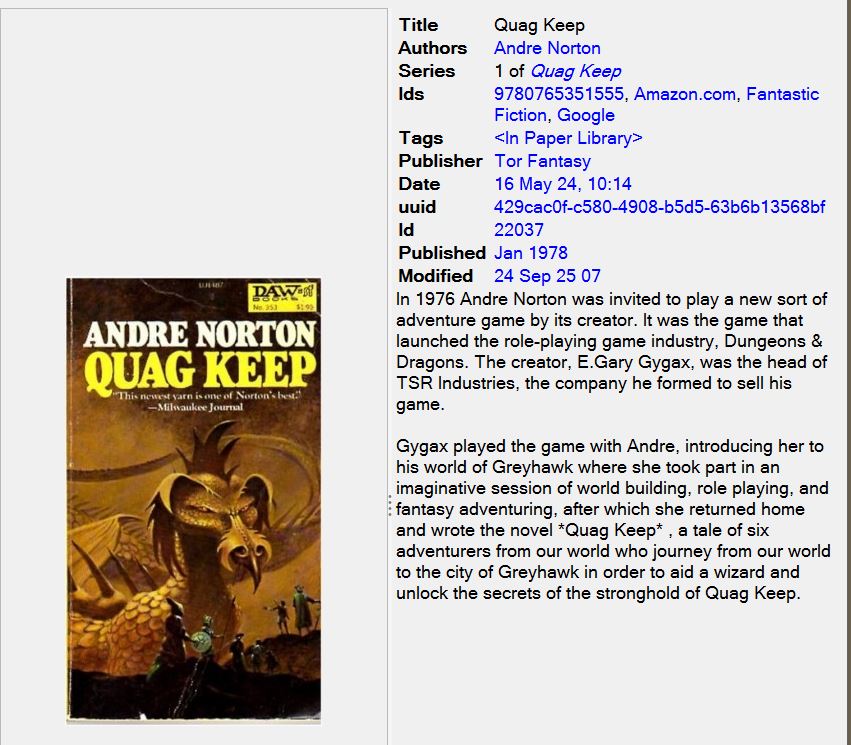 I do want to create a .pbook file as shown here https://www.davideaversa.it/blog/how...sical-library/ that uses TOML to describe book. So I create a pbook file for each of my physical books and I'd like to have them behave like normal ebooks, so I can add them from folder and subfolder etc. Also as it a plain text it would be great if with a double click the content is shown ![]() here: https://github.com/msavazzi?tab=repositories you can see the code I've developed to scan the books and create the pbook files. I've also created a plugin to read them but it is not a full "ebook" support. It allows me to add them one by one