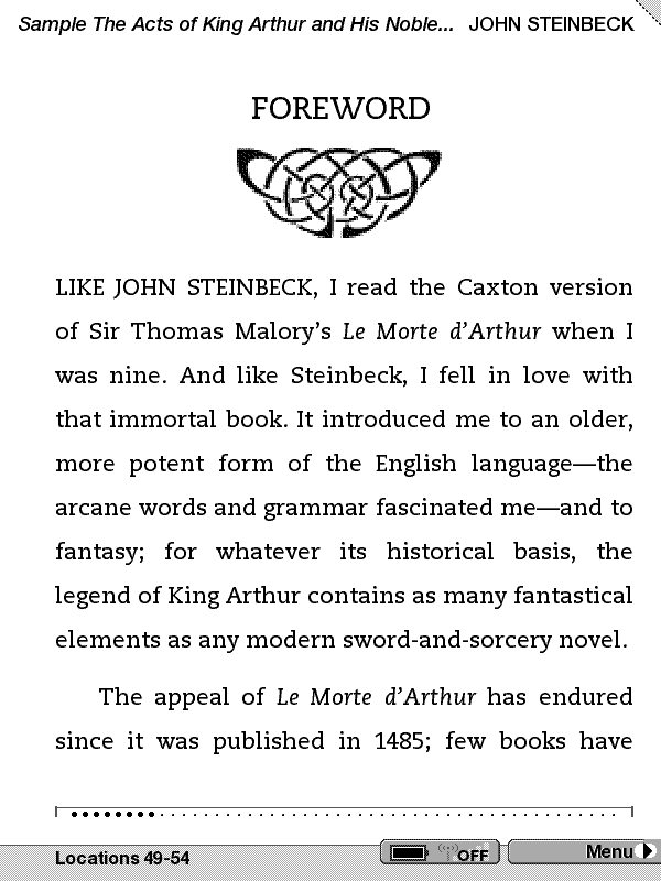The new version 1.2 firmware (see Kindle Upgrade) adds image zoom to AZW ebooks. Simply select the image using the scrollbar. It is tricky to get the Kindle's screenshot capability to work with zooms. I found that holding down <alt> and <shift> and then selecting the image and finally pressing <G> immediately after the zoom comes up usually works. The first two examples are wider than tall, and so switch to landscape for the zoom. Cover pages do not zoom, but sometimes a smaller version of the same image is on the 1st page and it is obviously zoomable. See example 3, which also illustrates than images taller then they are wide stay in portrait mode. The last example illustrates that even small images zoom to the full page size. Note that the original is already doubled in size, so the actual image is 104x56 pixels. Previously the "optimal" image size was 525x640. I'm not sure that zooming really helps enough to matter for portrait images, but for landscape (wider than high) images it may now be best to use 800 wide images which will be scaled down for the standard page but will show at full size when zooming. Last edited by wallcraft; 02-07-2009 at 03:38 PM. |