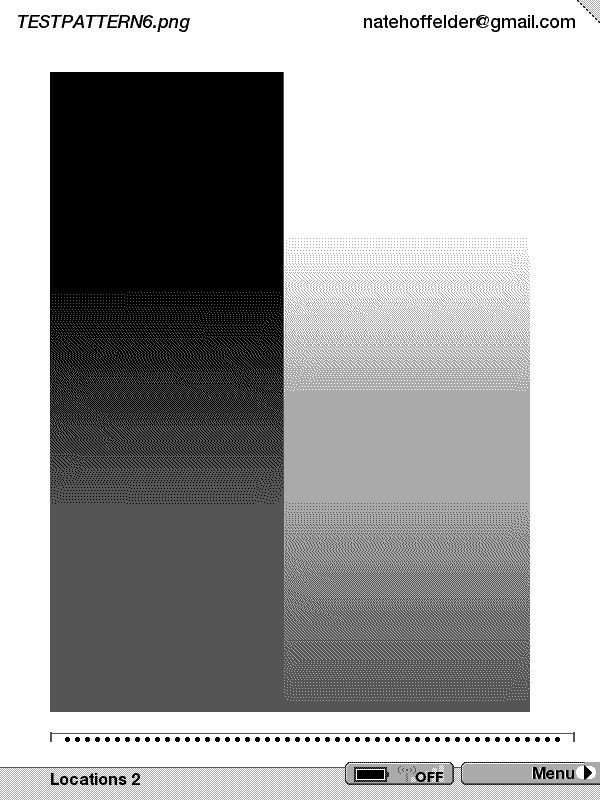 Kind of obviously, the palette ends up being #000000, #111111, #222222 ... #ffffff Not so obviously, only 15 shades of grey are rendered (both on the K2, and in the screen shot image). For whatever reason there's no #eeeeee. And if I make a 16 color image, again only 15 are rendered. |