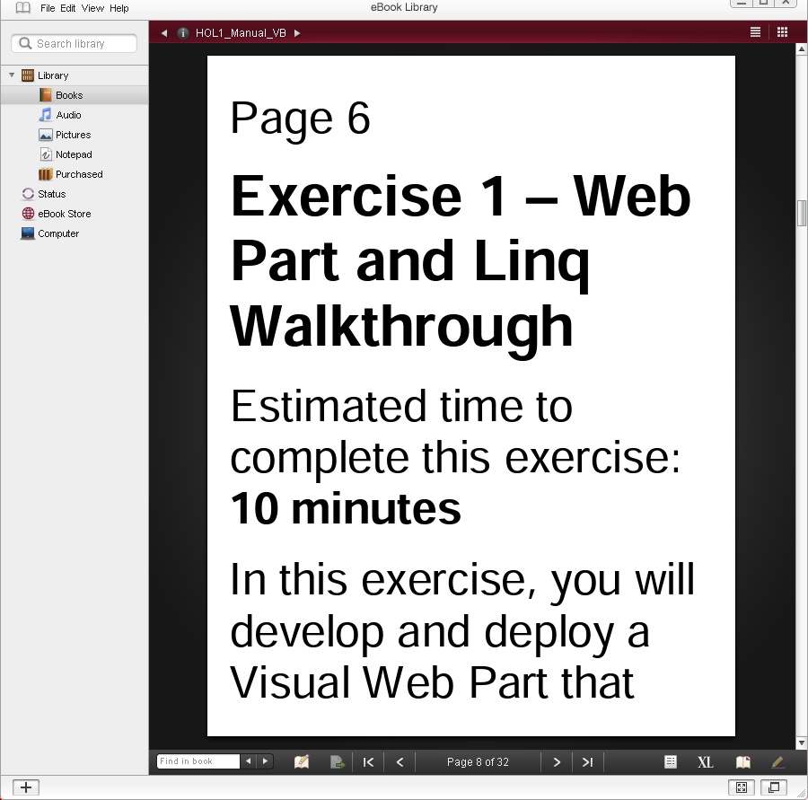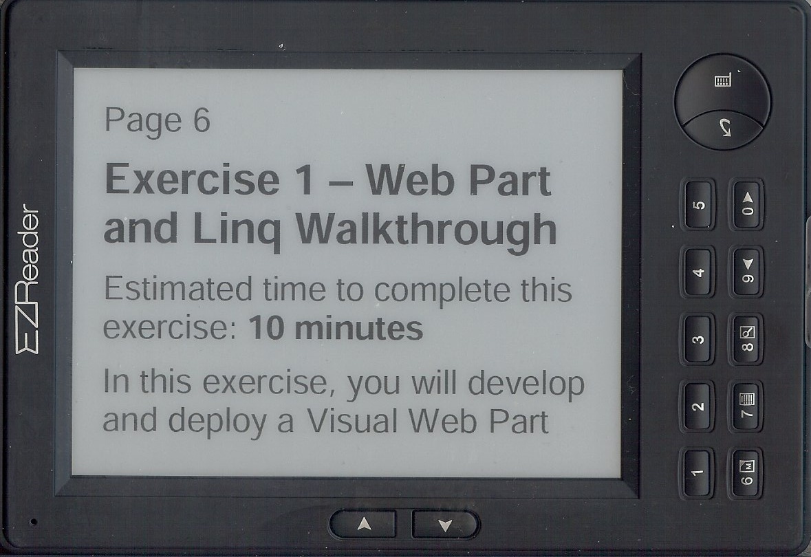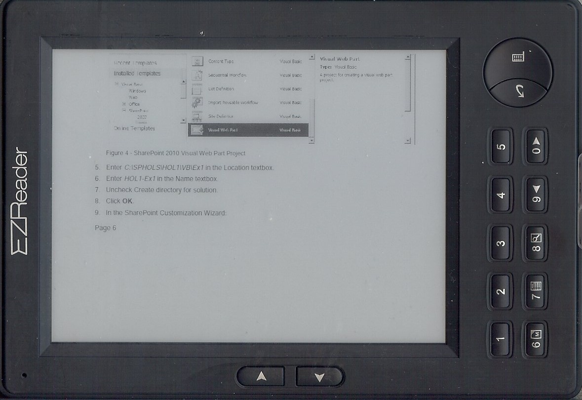 Scans from HOL1_Manual_VB.pdf at SharePoint 2010. The first two are using XPDF in landscape, which has full screen and landscape modes with margin cropping but does not reflow and does not support Adobe DRM. The second two are the same page using Adobe Digital Editions, it does not crop the margins. The next two are ADE with reflow, all the text is displayed but the image is moved to the end of the page. Don't forget the actual screen is only 3" by 4", and I find the landscape full page modes to be unreadable (they do give you an idea where the images are though).
