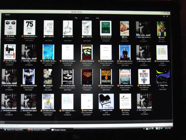 At the doctor's office I read a few pages of the owners manual that is on it, read an 11 page sampler that was among the several that were on it. A gentleman there saw it and said "no more dog-eared, out of date magazines while you wait." A few observations: In the exam room the florescent lighting in the overhead definitely caused glare. But there is very little to none in normal lighting. Like in my recliner. Swiping the screen left to right to advance a page was a bit unnatural to me. I turn pages right to left. Then I found the option to change it so that is fixed. Moving books and mp3s from my computer to the 900 using Reader was a piece of drag and drop cake. Now, setting up collections on the 900 is yet to be done. calibre did detect the reader and sent some news papers that weren't in the Reader Library. The soft case, for those who haven't yet seen one, is basically a screen cover that kind of snaps to the underside of the spine and is not actually soft. It has itty bitty magnets on the top and bottom outside corners to keep it closed. It will fold back under but not flat. It didn't bother me with it open like a hard back. It must be removed in order to place the 900 in the hard case. But I don't know how often I will use the hard case. And of course I have photos. With soft cover closed Soft cover open Closer look at home page My monitor after I had loaded some books and Diana Krall. Why not? |