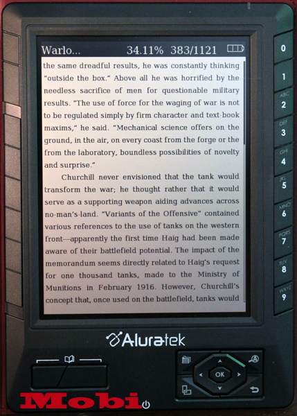 The Libre seems to display non-ePub books with way too much line space the way you described the JBL. I think it uses FBReader for non-ePubs. These books are readable but they look terrible due to the huge space between each line. It makes it look like an old type, double-spaced term paper from my college days! However, it displays ePubs very well, as the slightly blurry photos below shows. I was able to set the margins via Calibre to avoid the darn ADE page number fiasco. ... Last edited by jswinden; 03-14-2010 at 02:13 PM. |