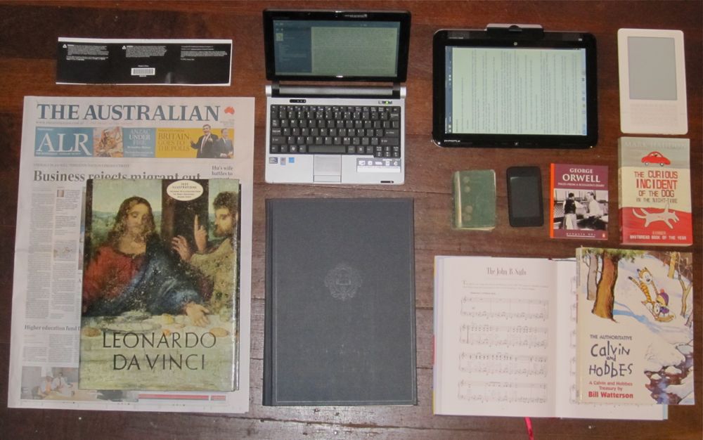 When I looked more closely at the various different things that I currently used for reading, the variety was enormous. In the print field it ranged from a tiny pocket dictionary through to large coffee table style books, and newspapers that were bigger than all of them. (see pic below) My on-screen reading already went from a 2” phone screen through to a 24” iMac. None of these are hard for me to read - not even the phone screen (the quality seems more Important than its size). One of the big surprises of the exercise was discovering how comfortable it was to real entire books on the little iTouch that I’d bought for music. My range of daily reading covers anything from text messages on the phone through to novels, instructions manuals, news sites, on-line magazines, forums, email, sheet music, etc and there really didn’t seem to be any particular reason why I should need to read any of it on something that is the size of the common e-readers. In fact, there were many compelling reason not to use devices with 5” or 6” screens as they mostly tend to do a fairly poor job of displaying the more complex formatting found in many magazines and manuals - if they do it at all. For instance, the Story and Kindle may have roughly the same external dimensions as some (unopened) paperbacks but their screen area is much smaller than the average paperback (half or less than the ones I compared it to) - and that’s just looking at a single page. A real book shows you two big pages at a time. This may or may not matter depending on what you're viewing. RE-ASSESSED CONCLUSION: For my needs there really isn’t any reason to assume that the size of a closed paperback novel is some sort of ideal or limiting size. In reality: a) I’m comfortable with a far wider range of sizes, and b) There isn’t a close correlation between e-reader screens and ‘real’ book sizes anyway. WEIGHT: This turned out to be even more unexpected than the size issue. My first guess was that anything much heavier than a regular paperback might soon feel uncomfortably bulky. However, after weighing a few of my books, I realised that wasn’t such a issue either. Plenty of my hard-backed books weigh as much as a small netbook, with some weighing several times as much (up to 11lbs or more). I also looked at how I hold books when reading. Basically there were three variations: 1. Sitting at a desk or table, typically with the end of the spine resting on the table. 2. Sitting in an armchair with the book resting on my lap 3. Lying on the couch or in bed with the book leaning against a convenient leg (often my own ).None of these required the sort of light weight that I might prefer if I was, for instance, standing up and reading for any length of time (which I don’t do). CONCLUSION: Anything up to 5lbs would be fine for my needs. In fact anything up to the weight of a cat, small dog or baby sits fine with me. In practice, I don’t find holding even the heavier printed books a problem when sitting at a desk or in an armchair. But, if I did feel like a change of position when reading electronically, any of the e-reading devices could be propped up and read ‘hands free’. I frequently read lying on the couch with the reading device leaning against my leg, only needing to use a hand at all when it’s time to click something to turn the page. Last edited by ChrisC333; 04-23-2010 at 02:47 AM. |