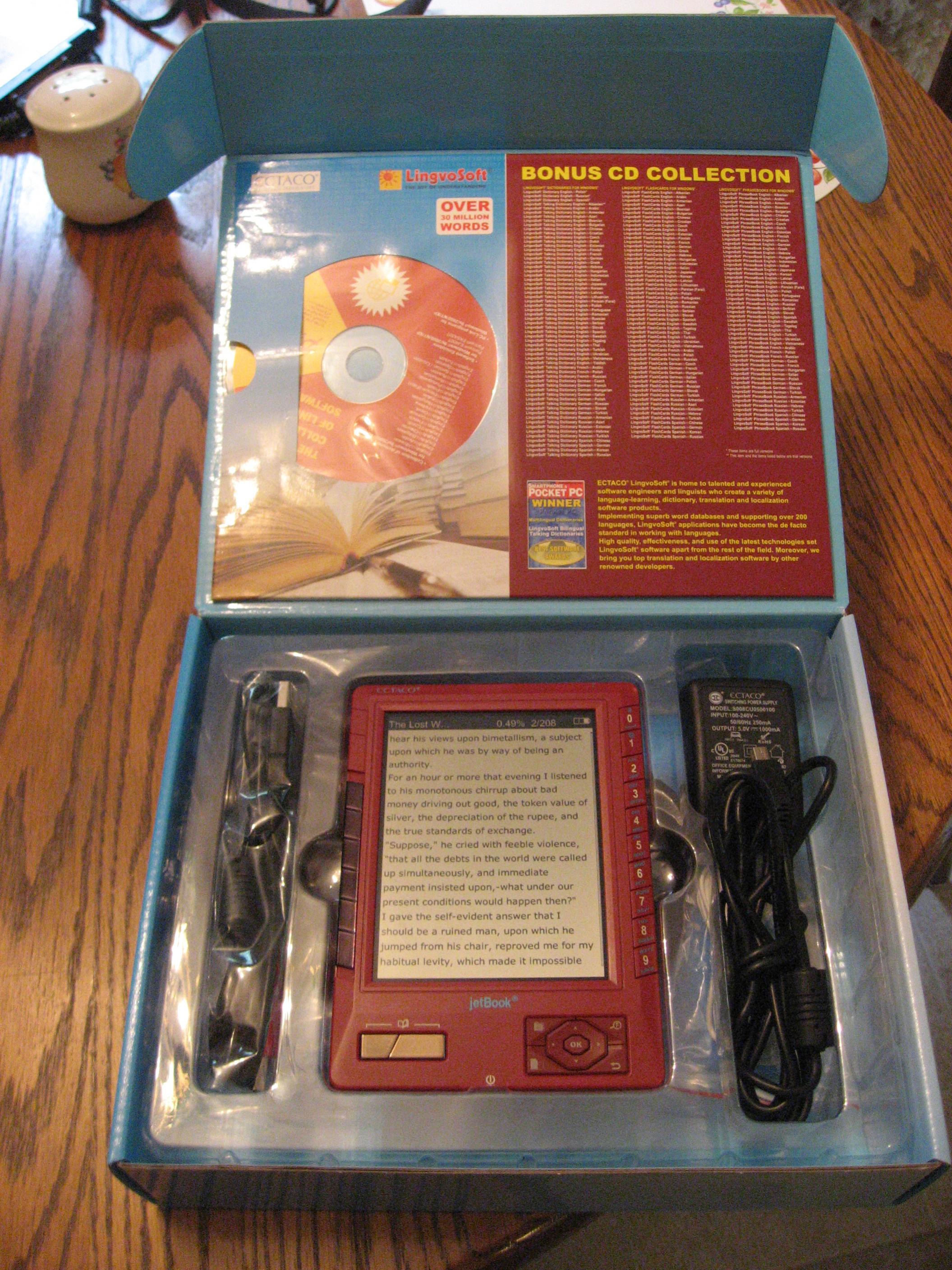 I have a lightly used Ectaco jetBook forsale. This is the original version with built-in rechargeable battery. It is red/bergundy in color. It is in very good condition and comes in original box with original accessories (Ac-adapter, ear-buds, slipcase, cd). Please note that it does NOT support any form of DRM'd ebooks at this time. It supports many formats without DRM (epub, mobi, fb2, txt, etc). It includes a bunch of preloaded classic titles. Asking $125 shipped continental USA. Sorry I don't ship outside the USA. Thanks.