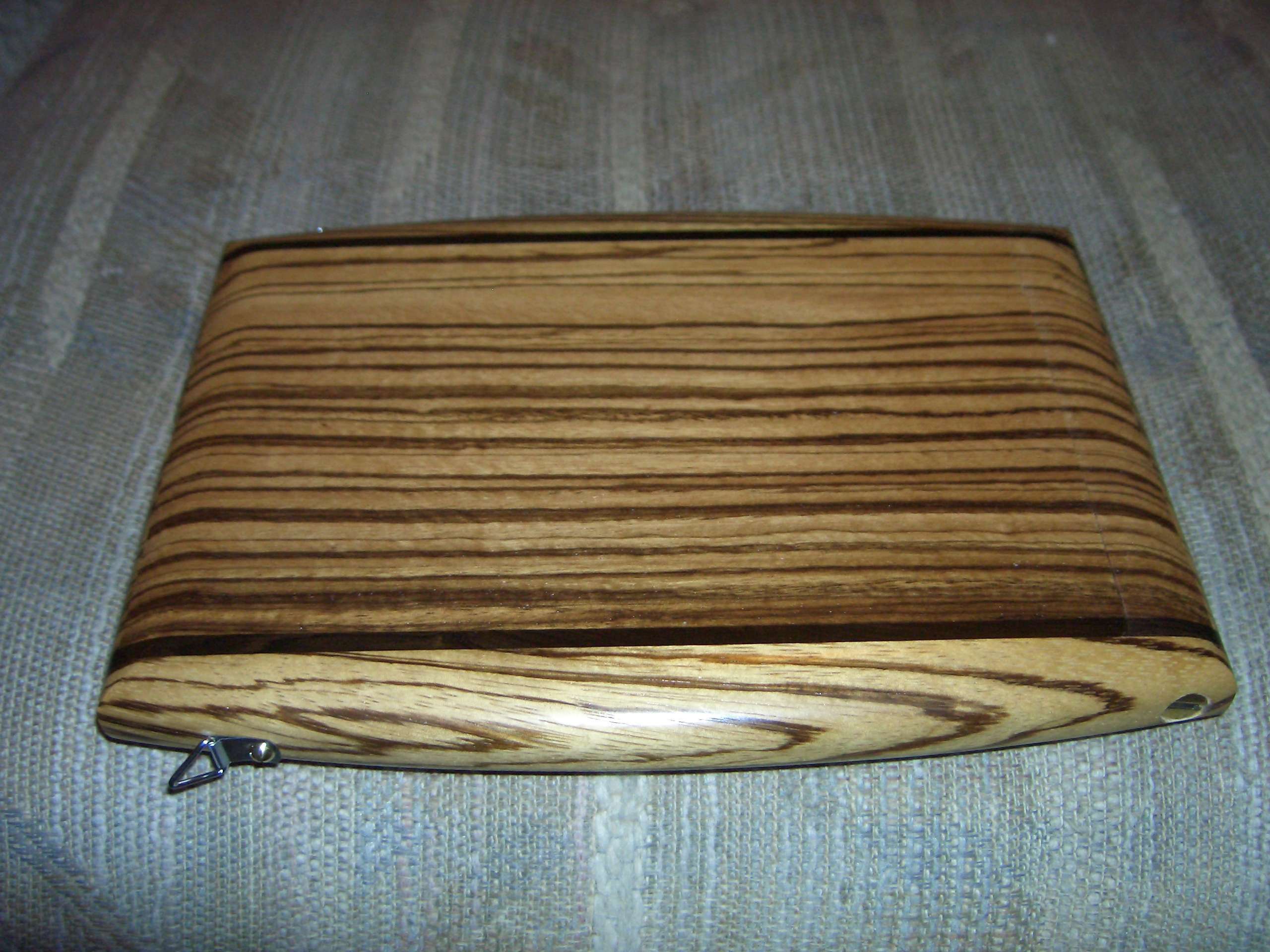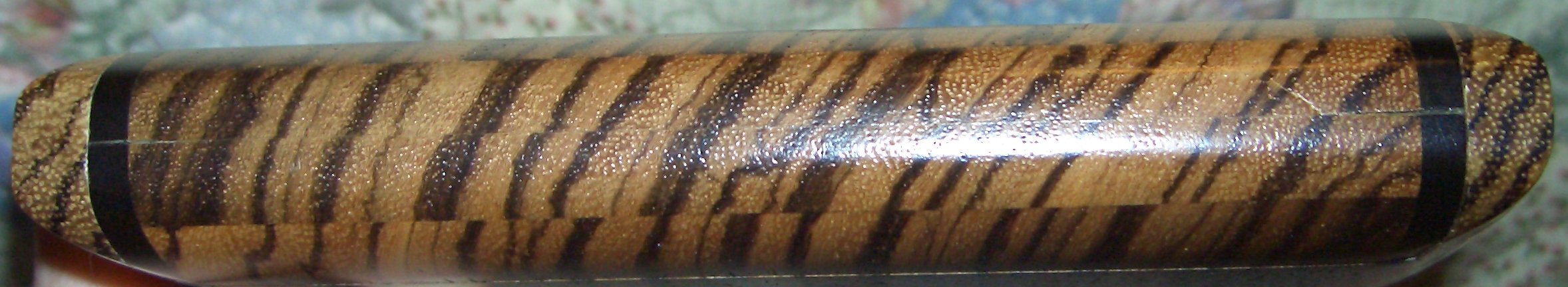 Okay, on to the box itself. My only coherent thought for the first five minutes or so after opening the packaging was a constant refrain of “It’s be-yu-tee-ful!” The box is a gorgeous piece of work, made of Zebrano wood with Blackwood accents its appearance is quite striking (see attached pictures, please). The finish on the box is a nice lacquer, and the form of it is very pleasant to look at and to hold, with flowing rounded corners and edges that are a joy to the touch. The overall construction is very tight, and the joining work is excellent. I’m not a professional woodworker, but my father was in a former life, and I watched him enough growing up to know good work when I see it, and this is very good work, indeed.