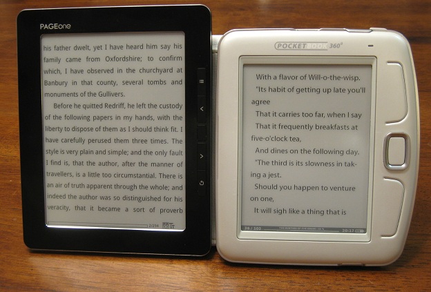 http://www.pageonestore.com ![]() I have been talking with the Vice President of NextPapyrus John Kim off and on for some time since finding out about their PageOne. Recently I have had time to touch base with them again and they were nice enough to send along one of the ereaders. First the Specs 6" Vizplex Eink display 157mm L x 125mm W x 8.4mm D 200 grams 2GB of on board storage Micro SD expansion up to 16GB MiniUSB 2.0 24pin connector (for wall charging) 3.5mm earphone jack 2200mA battery(read: HUGE) Reading Formats - ePub, PDF, MOBI, PRC, CHM, TXT, HTML, FB2, OEB, PalmDoc, Plucker, TCR, RTF Image Formats- JPG, GIF, PNG, BMP Audio Formats- MP#, WAV, WMA Its SOOO Small. Its got to be the smallest 6" reader available. It's actually not very much longer than a PocketBook 360 and they are the same width overall. The front bezel area is anodized aluminum and the back is a subtly curved plastic in a "piano black"(a bit like an iPhone). The edge of the alumium has the anodization buffed off to reveal a narrow aluminim edge "trim". The PageOne is also available in white. Overall is a really pleasing design in hand and so light I will have no trouble holding for hours. I prefer some of the readers I have tried in a case. The PageOne is one I think I prefer to hold naked. They do have a case for it of course and it has a couple of elastic bands on the cover that make it very easy to keep a grip on one-handed. I can bet that its very handy for strap-hanger commuters. The button controls are by default on the right side of the display in portrait mode. The device can easily be rotated to any of the other landscape or portrait orientations at the push of a button or by a selection in the menu. When you rotate 180 degrees the button functions switch as well so the "back" button operation is always on the bottom, the page forward button remains the "bottom" page button. The page buttons can be reversed in the menu as well. You can load your own fonts and change the pictures for the load/sleep screen. It does not support any DRM scheme so you need to know how to strip 'em if you've got 'em. You can choose to change the speed at which pages turn. There are 3 levels: Quality, Normal, Speedy. Quality is a "slow" full refresh which gives you a perfectly clean background and sharp text. Speedy is partial refresh that is so quick it finishes before i move my eyes from the bottom end to the top starting line. It does leave some shadowing after awhile but i find it quite bearable. Normal is a happy medium between the two and is about the normal speed you would expect of a eink reader. There is also a contrast adjustment. Normal , High and Higher are the choices. The difference between normal and Higher is quite noticeable with the blacks noticeably darker than the whites on the higher setting. High being a more subtle change. I had to ask what it actually does and it was explained that the device actually changes the gamma values. I havent tried it on pictures yet but Im sure it will be more dramatic. Ill take some pictures soon and make sure to include some other readers for comparison. Ill have some more thoughts after I read a book or two on it. So far its a delight. Im also going to lend the device to Nate the Great so he can give it a proper impartial review. Its currently available only in Korea for a price of 234,000 WON which a quick conversion puts at $198. |