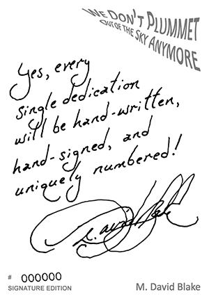 EDIT: The 10-14 July 2010 eBook Signing Event is finished. Yes, you can still get a signed eBook! See here for additional information. . . . . . . . . . . . . . . . . . . . . . Book signings are a wonderful way for readers to brush elbows with the authors they love, and for authors to get to know the people who have been enjoying their stories. You just wait in line until you reach the head of the table, whereupon the author picks up a pen, flips to the flyleaf, asks your name, jots down something witty, and then with a quick flourish swirls something that is probably illegible, but that you can assure your friends is a genuine signature. Oh, wait... you went and bought an iPad. Or was it a Sony? A nook, you say? Maybe it was a Kindle. There are just so many eBook readers these days, and each one can hold thousands of eBooks. How many signatures can those things hold, anyway? What sort of pen should the author use on your shiny new toy, and what will you do if someone accidentally gets ink on the screen? Perhaps it is time for MobileRead.com to show the way, by hosting an eBook Signing Event! . . . . . . . . . . . . . . . . . . . . . "Wait a minute," I can hear some of you muttering, "how are you going to do that? eBooks don't even have a flyleaf to sign, for crying out loud." No, they usually don't, but they could... and now they do. To demonstrate, I am signing copies of my first published * SHORT STORY *: The regular, non-signed edition of "We Don't Plummet Out of the Sky Anymore" is also still available at Smashwords.com, but this version is a little different, because every single dedication will be hand-written, hand-signed, and uniquely numbered. Why am I going to such lengths? To be blunt, I really do believe what I wrote about book signings being a special interaction between readers and writers. I want people to read my stories, and enjoy them, and hopefully also keep an eye out for my name in the future. As writers, it is important for us to invest a little time in that relationship, because it won't develop at all if we don't. . . . . . . . . . . . . . . . . . . . . . Would you like to participate? All you need to do is send an e-mail to this address: MDavidBlake <use a DOT> writer <use the AT symbol> vintageseason <use another DOT> com ... and be sure to include the following information, so that I can get your dedication right!Subject: eBook Signing Event: We Don't Plummet Out of the Sky Anymore The *.epub and *.mobi files you receive will be DRM-free, and you are welcome to make copies for your friends, because if you enjoyed the story, they might enjoy it too. You are expressly granted permission to share the specific *.epub and/or *.mobi file(s) you receive from the author, with two stipulations:Name: what you want the author to call you E-mail: an address where the signed eBook should be sent