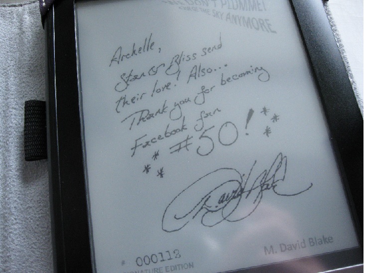 I wonder if it could be streamlined: a tablet instead of paper and scanning, and a little script to swap in the new signed page to the ePub source, and then zip up a new copy and generate the Mobipocket using KindleGen. It wouldn't help with writer's cramp from all the signing, but it would speed the process up otherwise. Hmm... it could even send the email automatically. And then there's ebook readers that have touch sensitive screens.... I wonder who'll be the first to add a way for authors to sign ebooks on an ebook reader? |