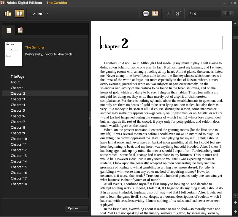 There is a real need for a ePub compliance checker. I'm not sure Dostoyevsky-The_Gambler is a valid .epub. It fails using Lector for example. FBReader can read it, but it currently lacks TOC support which is a bit limiting. |