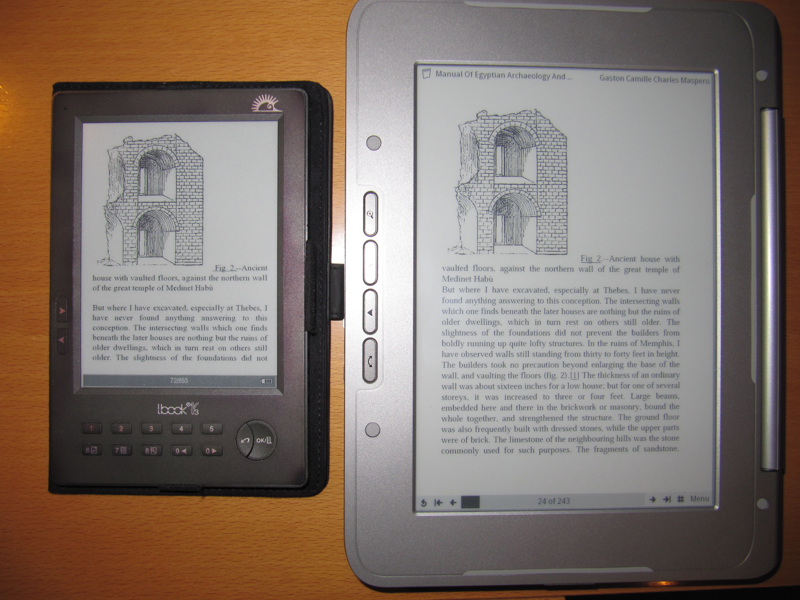 Da ich gestern Abend mal etwas mit einer Lampe, einem Zollstock und zwei eReadern ausprobiert habe () und dabei auch noch die Digitalkamera dabei hatte anbei zwei Vergleichsfotos (mit Blitz) des eDGe neben einem lBook V3 (= Hanlin V3) mit Vizplex-Display.