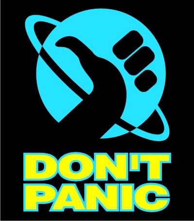 Here's a pic of the "DON'T PANIC" t-shirt I got off of eBay, in case anyone is interested. You'll find it at an eBay store named "Gothic Alchemist".