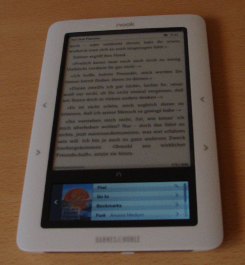 (Eins gleich vorweg: Den Coverview gibt es nur für von B&N stammenden Content aber nicht in "my documents")Ich schau also mal in den "Dracula" rein. Die Formatierung ist in Ordnung, nur fällt mir sofort auf, dass Absätze durch einen ziemlich großen Abstand getrennt werden. Wie sich später rausstellt ist dies das Standardverhalten, falls die Absätze im ePub nicht explit Abstände spezifizieren - und das tun bei Weitem nicht alle Kauf-eBooks. Ansonsten sieht das echt gut aus. Keine störenden Seitenzahlen auf der rechten Seite wie bei Sony oder auch bei Pocketbook. Die Seitenzahlen sind in einer Statusleiste am unteren Displayrand zusammen mit einem "Lesefortschrittsbalken" untergebracht und stören somit überhaupt nicht. Am oberen Displayrand gibt es eine weitere Statusleiste, welche den Buchtitel, den Batteriestand sowie die Uhrzeit anzeigt. Geblättert wird entweder über die Hardwaretasten oder mittels einem "Swipe" auf dem Touchscreen - das funktioniert gut und auch dann, wenn sich das LCD abgeschaltet hat. Via Touchscreen hat man folgende Optionen zur Verfügung: