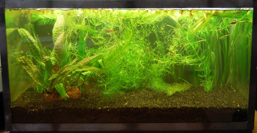 Only 6 weeks old, but it very quickly found a healthy equilibrium and the plants are growing like crazy. It's set up following the Walstad method (low-tech, soil beneath the gravel). I've done some much needed weeding today, and now I'm crossing my fingers and hoping I haven't upset the biological balance too much. 50x25x25 cm, flourocent strip light, 15W, 4200 K 1,5 cm soil, 2,5 cm fine gravel Plants back left to right: Hydrilla verticillata (a waterweed) Heteranthera zosterifolia (Stargrass) Vallisneria spiralis A Microsorium pteropus (Java fern) to the left Floating: Ceratophyllum demersum (Hornwort) Salvinia natans Limnobium laevigatum (Frogbite) Fish & other critters: Guppies ("wild" colour) 5 Dwarf rasbora Hyalella azteca (an amphipod) Thinking about adding shrimp in the hope they might out-compete the snails (and because they're cute). Last edited by Ea; 07-28-2010 at 05:23 AM. Reason: typo |