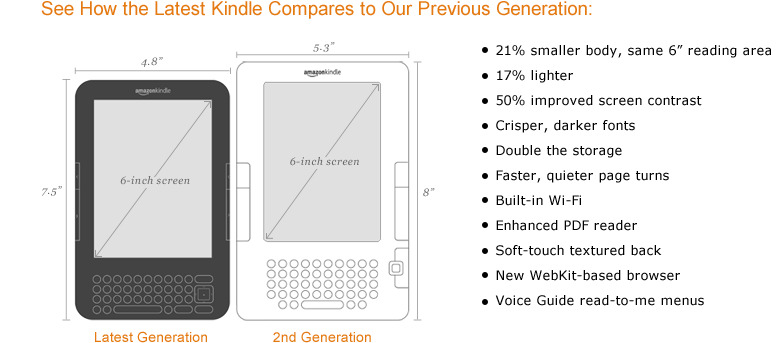 Yup, this is indeed huge. It's a very well thought out upgrade edition. WiFi is nice because it's simply faster than 3G. Always connected is critical to the Amazon value prop; I can't imagine a non-Wifi version. Sony, Astak and all the smaller players, better have exit strategies or something really stunning to stay in market. B&N and Kobo have each taken a different approach and each support epub -- they have some wiggle room. In Kobo's case, however, the price simply has to come down; they have no other levers to pull. And I don't mean to write off Sony -- just they need to have had something major cooking and have it in market by Sep 1.