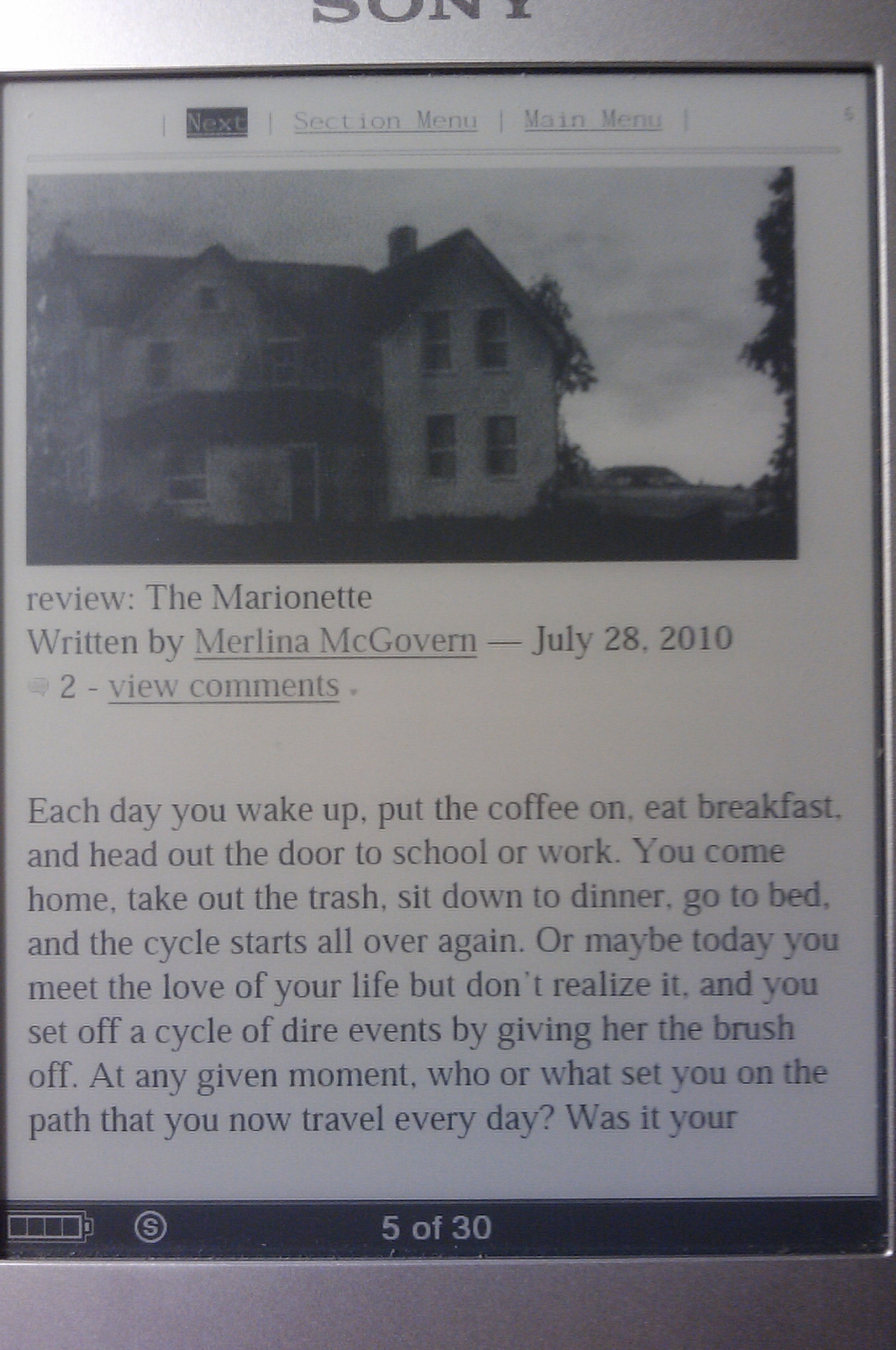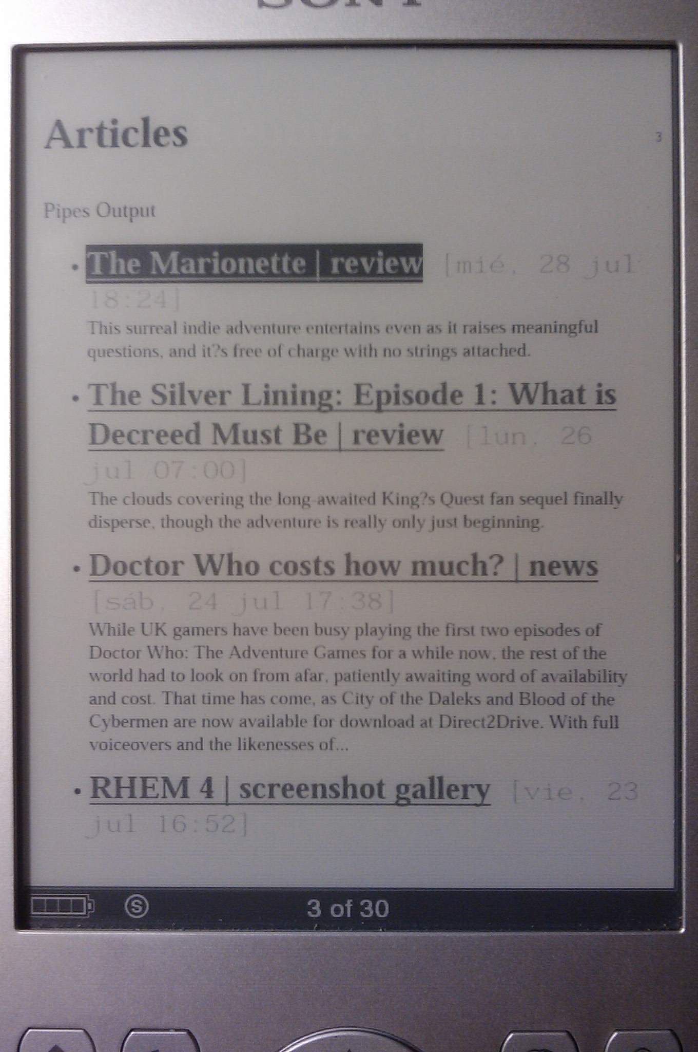 The links in ePub still do not work. I downloaded the news for Adventure Gamers with Calibre, and shot pictures of the first two pages in both ebookapps and Sony modes. Please find attached ebookapps1-2 and sony1-2. As you can see, it's a complete mess. Maybe this is fbreader's fault? Also, it would be nice having a history of recent page views, as in the official firmware. It is very useful when you lose track of the last page viewed, or when you use hyperlinks and you want to go back. I have noticed that after using the ebookapps firmware, Calibre refused to connect to the Reader. I had to delete the "metadata.calibre" in the root folder of the device, delete the ebookapps firmware, reset the device and come back from idle mode. Deleting the "metadata.calibre" is not enough, nor is just resetting the device or deleting the new firmware. Some combination of the above is required. Very, very annoying. All in all, a very good release.