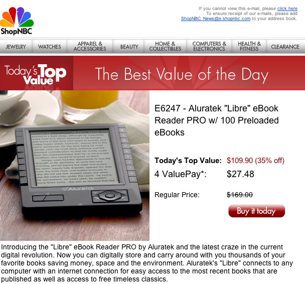 I got a message from ShopNBC, the Aluratek Libre ebook Reader Pro is on sale for $109.90.