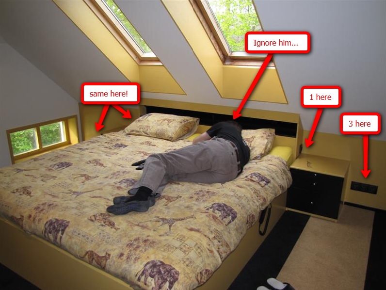 You know, that's where good planning comes in handy! When we designed our bed (it's completely hand-made by that very handy-with-wood husband of mine, though I painted it [with a little help from my mother, I admit]), we recognized this problem. So, both sides of the bed have 4 power outlets. Three on the floor (you know, for an alarm clock and other things you'll want to keep plugged; nothing there yet but the alarm, but still...) and one on the bed itself, right above the nightstand. And those I can use for my charger when I find out I'm empty in the middle of the night and still want to read without having to use the bed light...