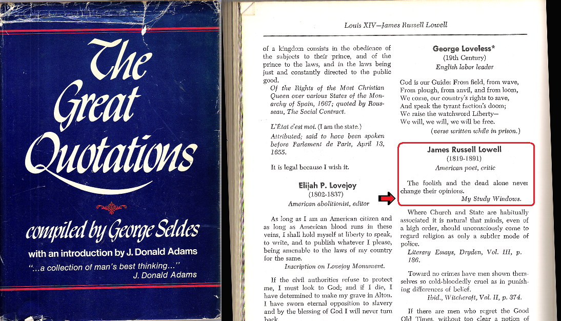 I read the entire 1884 Birmingham speech ("On Democracy") by James Russell Lowell last night and discovered something remarkable: the quotation ("The foolish and the dead alone never change their opinion.") wasn't in there! Being as how I had typed it by hand into a Word document in the days before OCR scanners were commonplace, I returned to my source to see if I had mistyped, but no, I hadn't. It's sourced to that speech in The Great Thoughts by George Seldes (1985, Introduction and a new compilation © 1996 by David Laskin). George Seldes died on July 2, 1995, and the updated version with a new compilation by David Laskin wasn't released until May 21, 1996, so thinking that his heir to the throne may have not been as meticulous in his research as Seldes, I got out my copy of the older Seldes book, The Great Quotations (1961), for comparison; and in this one he credits the quote correctly to Lowell's book My Study Windows (1871). This was confirmed by a quick peek at the Google Book version which revealed the quote to be present on page 166 of that work.