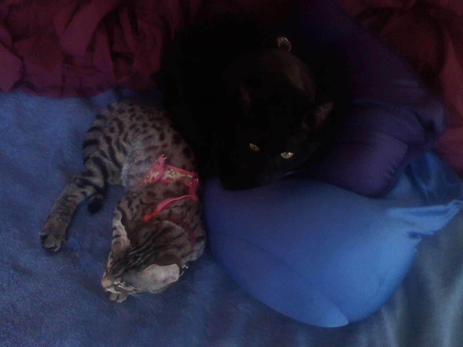 after yesterday's comedy of feline errors and unauthorized cat circus I decided to put them in their harnesses and just have them hang out in the house. Strider thinks it's fun to undo the back part of Arwen's harness *sigh*