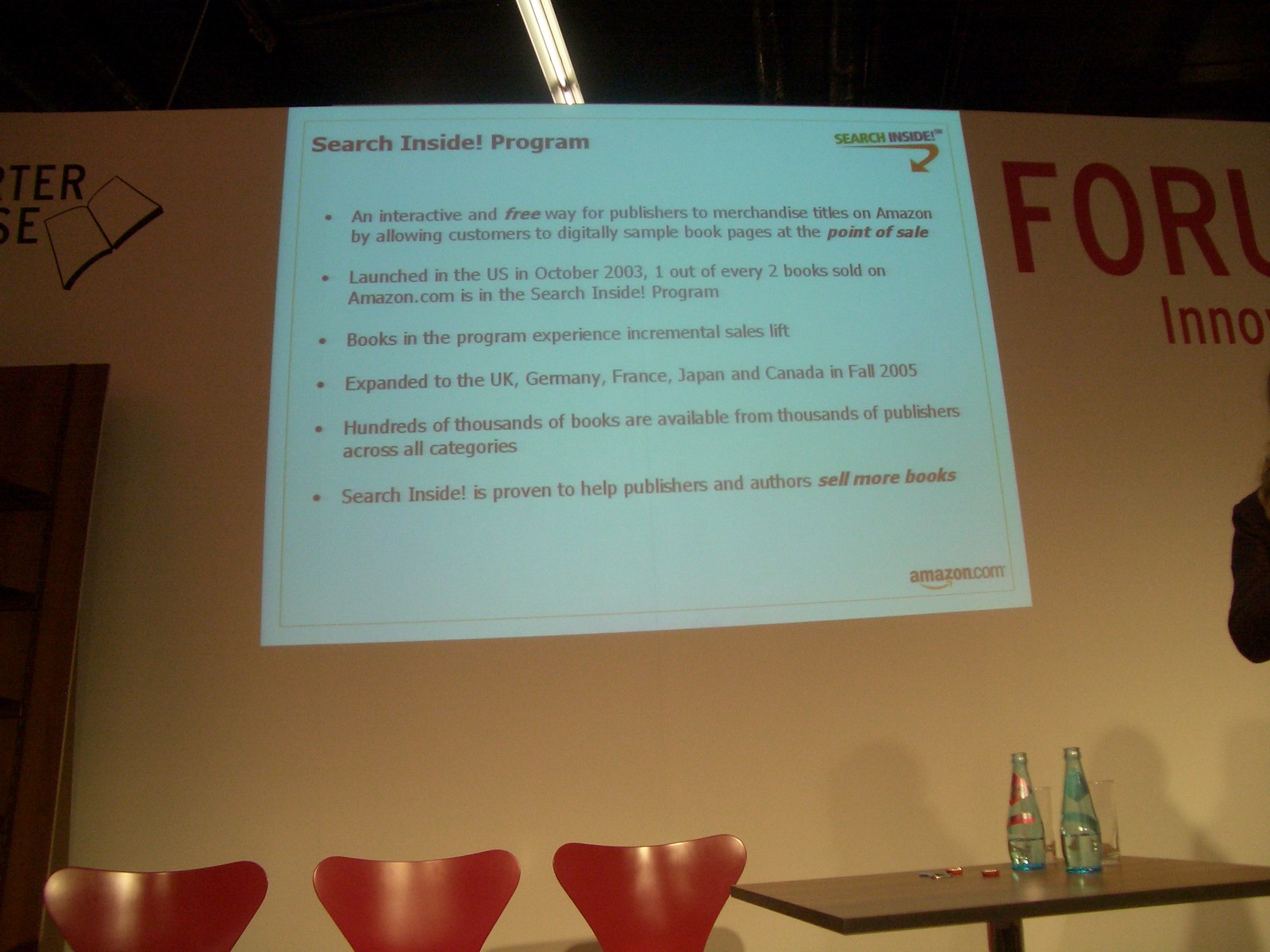 "We don't comment on speculations and rumors" is what I heard today from Genevieve Kunst, Amazon's European Head of Business Development for Digital Media, when inquired about the status quo of the Amazon Kindle e-book reader. Instead, Mrs Kunst elaborated for almost thirty minutes on how Amazon's Search Inside! feature helps publishers boost their sales (by a "statistically proven" good 6 percent) and how Amazon Upgrade, basically an extension of Search Inside!, allows customers to receive full-text access online (for an additional fee of course). Both features are still easily overlooked on Amazon's excessively crowded and busy pages, but Mrs Kunst pointed out that those will be better integrated in near future. She also touched upon the topic of e-books by mentioning MobiPocket and eBookBase; but really, nothing new here either.Now, I'm sure there's a perfectly reasonable explanation for the information embargo surrounding the Kindle reader. Whether just clever marketing or an actual technical reason for a possible delay, it remains open to speculation (here we go again) whether we will see this drool-worthy device unveiled any time soon (like, say, October 15). Related: Amazon Kindle likely launch date: October 15!, Kindle Launch at Frankfurt Book Fair?, "Kindle Editions" showing up on Amazon |