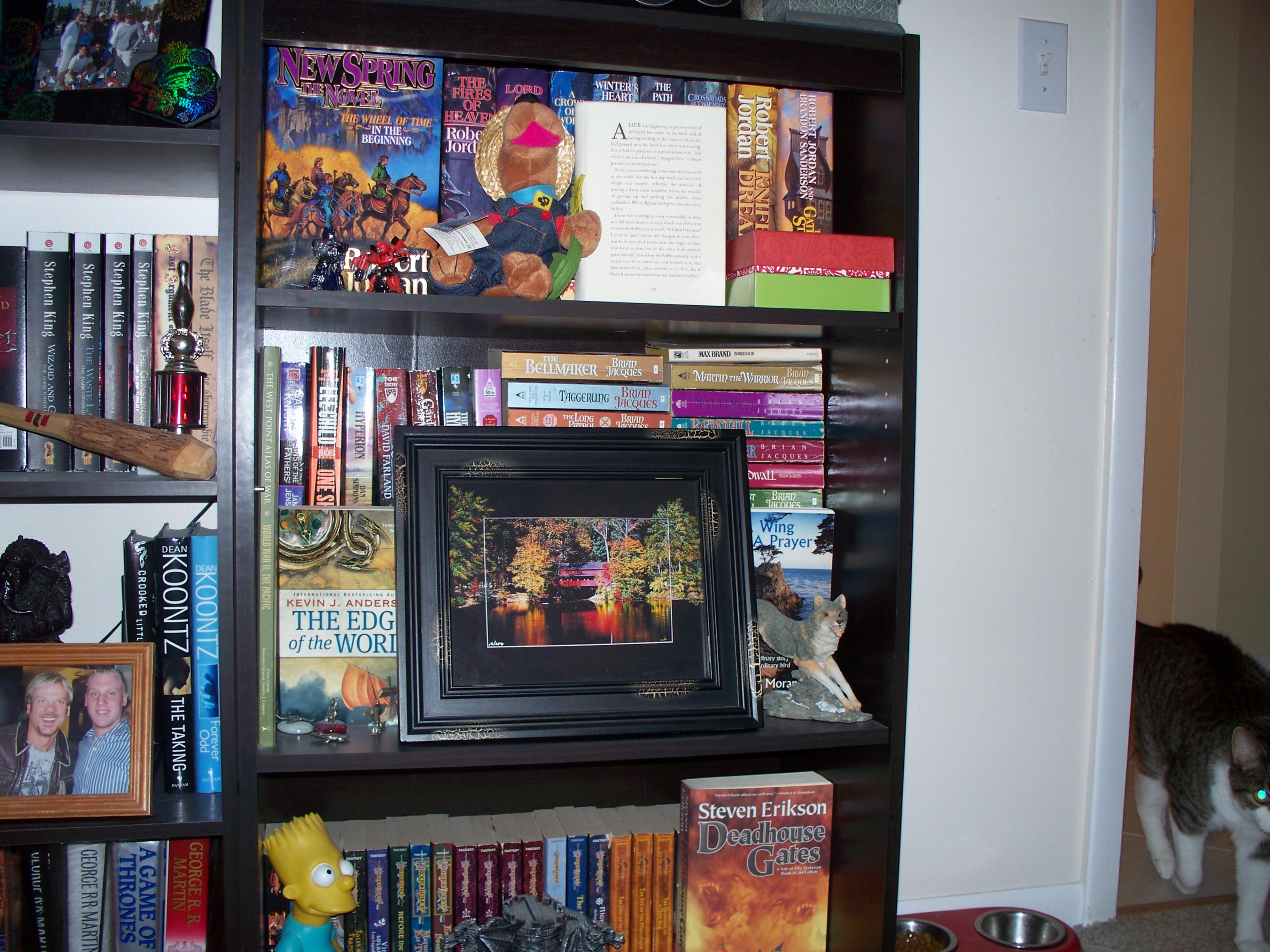 I have no pics of books on shelves, because there ARE no bookshelves in our new apartment. Well, there's one, but it holds all my plates and bowls like a china hutch. I have two paper boxes of books I wanted to keep in storage. The rest I got rid of before the move. We move way too often for me to have much of a collection. Hubby kind of puts his foot down on moving heavy book boxes all the time.