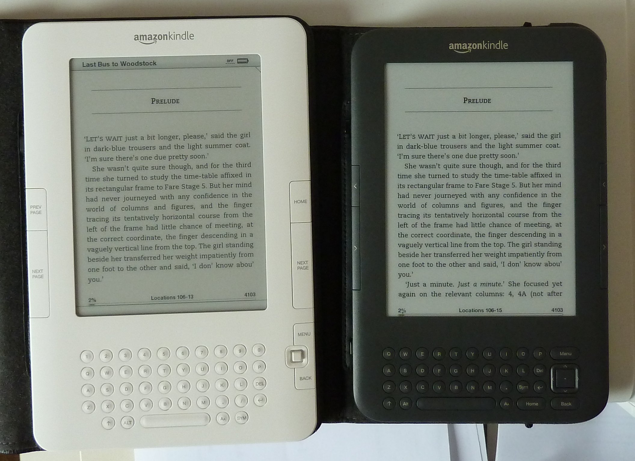 Here's another side-by-side comparison of the K2 and K3 displaying the same book. The K3 has a clearly whiter background and blacker text than does the K2, as well as being significantly physically smaller.