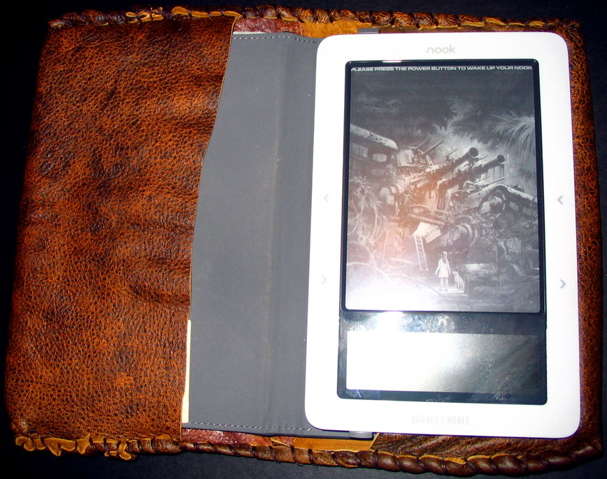 My Nook has a Industriell Cover. Its useful feature is that it clips onto the Nook in the upper and lower left corners. It does not attach on the right side at all. The Grichels make bizarre leather goods with faces on them. http://www.grichels.com/ http://www.etsy.com/shop/grichels They were at a local Craft Faire I attended. I discovered that their Small Journal/Sketchbook fits perfectly over the Industriell cover. Now, this is not cheap. The Industriell is about $30, and the Grichel cover is about $85. But my Nook looks incredible! |