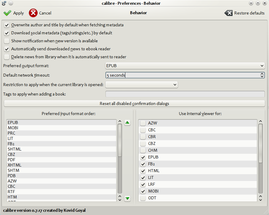 I just finished implementing a new preferences dialog (screenshots attached) and I'd appreciate a little feedback on the new design. For those of you that run calibre from source, the changes are committed, you can try it out for yourself. Some of the nice new features are: 1) You can restore settings to calibre defaults 2) More context sensitive help (tooltips) 3) A nice modular design based on plugins for easy expansion in the future. 4) A more discoverable layout |