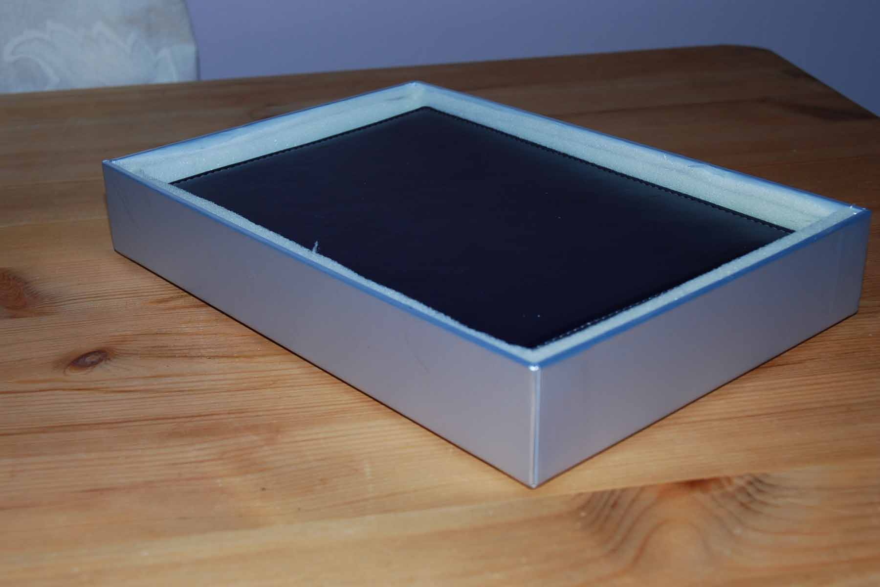 First one: I measured my reader. Then I have cut two sheets of 5mm thick plywood. I have laminated one side of plywood using thick glass fabric (500grams per square meter) using epoxy resin (I have had some resin with long past expiration date - this is why the lamination is not transparent). Then I cut three sides from a piece of wood with 1cm x 3cm crossection and and glued and screwed them into the sides in such a way that the laminated layer is *inside*. Then I rounded the edges and laminated the outside of the case using finer glass fabric and epoxy. Finally I have lined the inside of the case using remains self-adhesive strips of foam I have been using to insulate doorframe. The construction is very quick, very ugly and very, *very* strong. The laminated layer inside gives the case very high rigidity. I think it can survive being run over by a car. The second case: I have been carrying a piece of cardboard cut exactly to the size of Reader in my bag from the moment I have arranged for my reader to be bought for me. I have been looking for a nice case (with that piece of cardboard in hand) everywhere I went. I tried numerous boxes, food containers, cases, suitcases, sets, toy containers ... ... finally I have found a perfect tin case. I have purchased a set of threading tools for $10 in a "super bargain" bin in a local Lidl supermarket. The threading tools are most probably worthless and will break during the first use. It does not matter. I was willing to pay that $10 (in my local currency) for the tin box alone. I use the wooden box when I need extra protection for my reader. The tin case is perfect for carrying my Reader in the notebook case together with a notebook on business trips. |