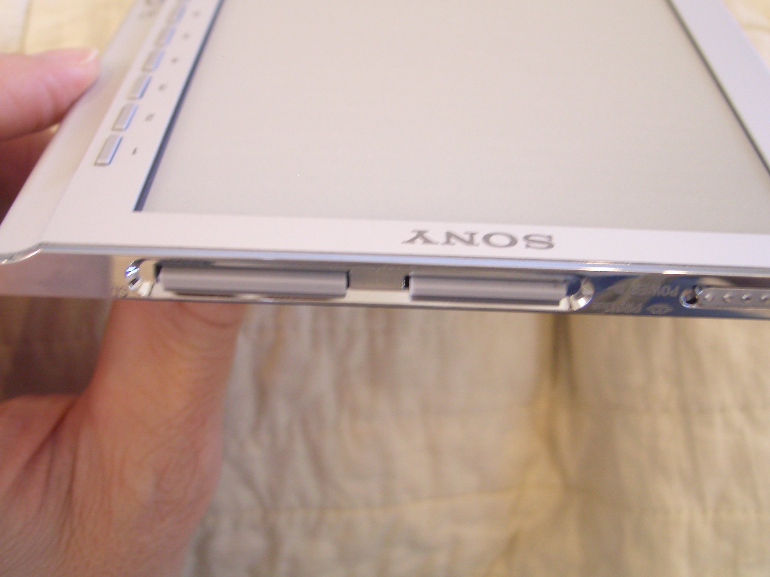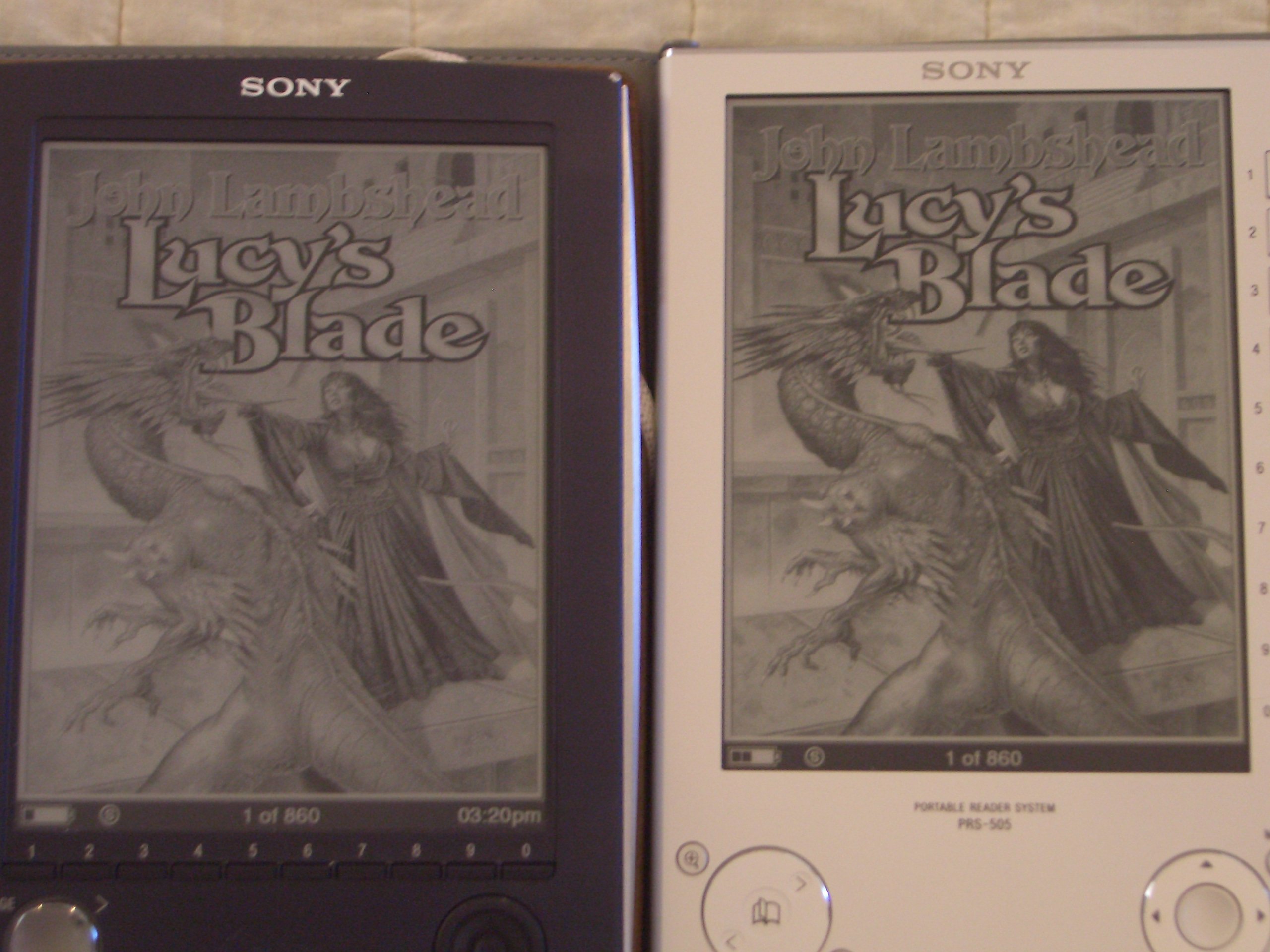 Through the gracious auspices of Sony's PR firm, PainePR, I've had the chance to review a 505 unit for the last two weeks (alas, it goes back to them today).In that time I've tried to focus on the differences that I've seen between the two models, and consider what I think of those differences. I will inevitably re-cover some items that others have mentioned, please bear with me, I'll try to bring out something new on those points, but some I just consider particularly important. As you will see below, I also tried to get some good figure study shots of the 505, and where applicable side-by-side comparison shots with my much loved 500. I'm not the best photographer in the world, nor do I have a fancy set-up, but hopefully the pix will answer some questions for some folks. I'll start with the Desktop software because I can cover it fairly quickly. Formerly known as the Connect Reader Software, the new version (as most will know) goes by the name of eBook Library. The new software installed easily over the existing one without any issues that I noticed, even replacing the existing icons for the old software with icons for the new one. I assume that it wouldn't find shortcuts that are in non-standard locations, however, I can't confirm that as I didn't really have any other than the ones the original software created. It found my existing books, and left my collections as they were, and seems to run a bit faster than the old version. In particular, registering the new device seemed markedly faster, but that could also be improvements in the on-line portion of the operation since the time I registered my 500 last year. I've also found it to be more stable than its predecessor. A brief note on the Connect Store. I noticed a detail or two in the ConnStore that seem worth mentioning here. I believe the wishlist feature they've added has come up already, but I noticed that you can set up a request for notices of new books by specific authors. This seems like a great idea to me, as I tend to follow certain authors. Okay, on to the 505 itself! I should probably start with the display. I've included a couple of side-by-sides of the displays. They're not all that great quality-wise, but they do give a good idea of the difference between the displays themselves, you just have to adjust mentally for the fact that both shots are darker than the reality. The page turn speed may be (very) slightly faster, but the change in the way that the image is refreshed makes it seem to come up faster, and I found it less bothersome than the old one (which, admittedly, didn't bother me much in the first place). The new display is noticeably brighter, and as others have commented, that makes a big difference in lower light situations. I suspect it will be easier to find good clip-on lights for the 505 than it has been for the 500. The most noticeable speed improvement on the display is in navigating menus, where it is markedly quicker. The unit casing is, as nearly as I can tell, a seamless metal sleeve, with caps at either end. I didn't try to open it (which would be rude), but it looks to me like the thing would be a bear to open without knowing exactly what you were doing. I do like the feel of the casing, texture-wise, but having now seen a silver unit in person, I have to say I remain in "dark-blue" case camp. I do feel that the silver de-emphasizes the e-ink's contrast somewhat. The stock cover is a nice faux leather (some sort of vinyl at a guess), and I particularly like the fact that it has no nape, inside our out, to pickup dust and such. The cover does fold all the way back, and makes for a nice holding feel. I found that by putting my index (pointing) finger between the two covers, I had a very good grip on the device (see the pix below). As a point of interest, though I've been a big proponent of the wrist lanyard for the 500 model, I didn't miss it on the 505. I think I'd be more likely to put a neck lanyard on it so that I had some protection against dropping, but I don't miss the wrist lanyard for general holding security. I also found that holding the unit at the bottom, as I would a paperback, with the cover open and my thumb on the larger round page turn button (again see pix) was quite comfortable for either hand. I was actually mildly surprised to find this so. Also the right hand page buttons are a significant improvement over the previous incarnation. I never really had any issues with the original, but there is no question that the new ones are not only bigger and easier to press, they're better positioned, and the shape difference provides a nice tactile reference as to which is which. The navigation pad is a big improvement over the jogstick -- no more worries about knocking the little stick off. The feel of it is crisp, and the larger ring makes controlling things easier. Others have commented on the relocation of the power switch. I also found myself trying to turn it on and off on the side, but I adjusted quickly enough. I like the more aggressive texturing on the new power slide, which makes actuating it much easier, and I actually like the top-edge position. It allows the unit to be switched on and off with the cover closed, which is a nice thing. Also, the charge light is on the top now too, which means it can be checked without opening the cover. The new charge light may be a bit brighter as an added bonus. Under the Settings menu, the Time and Date can now be set without the aid of a computer (pic below), which is nice as the 505 still loses it's time sense after a week or so without talking to a PC. Setting the time and date in this menu is quite straightforward, using the nav-pad and number buttons. Speaking of the number buttons, I heartily approve of the new placement. Their new location makes selecting menu items with them much more intuitive. The only real drawback I see to the placement is that they're even more likely to get pressed with the cover closed. However, since they 
