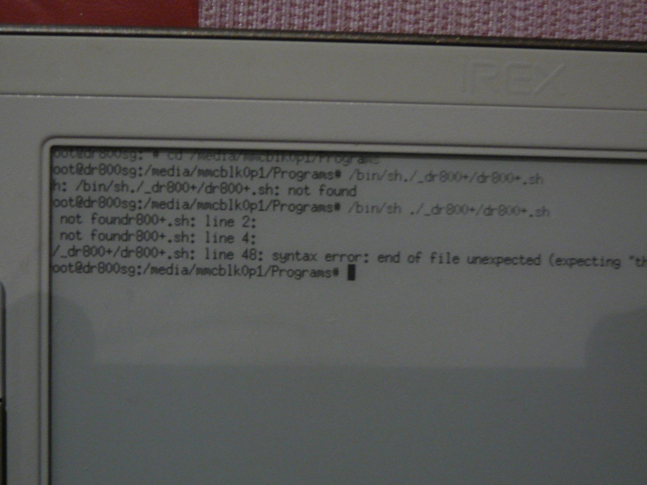 ok, ok... in [1] you can find "rxvt", a terminal emulation program for the DR800, something like the command line application you can use on a windows machine when you hit Windows_key+r and type "cmd". If you install this program, you could type the commands with the virtual keyboard and see the errors. Thus, install rxvt and run it. Then type next commands: Code: