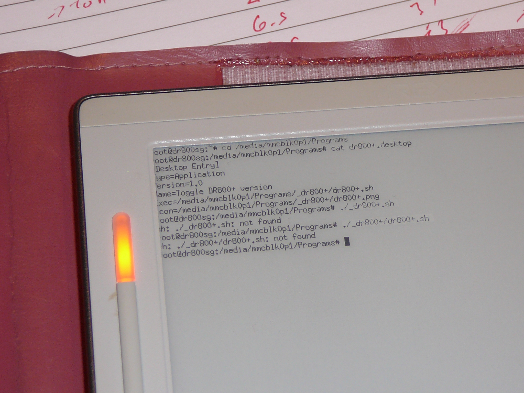# cd /media/mmcblk0p1/Programs # cat dr800+.desktop # ./_dr800+/dr800+.sh Then take a photo with a mobile phone or camera and post it here. In case you couldn't take the photo, copy and post the errors showed in the device screen. Yes, it can be quite complex if you haven't used a computer from the command line, and hard to type all these strange characters in the virtual keyboard, but i can't think anything better. Iņigo [1] https://www.mobileread.com/forums/showthread.php?t=81119 |