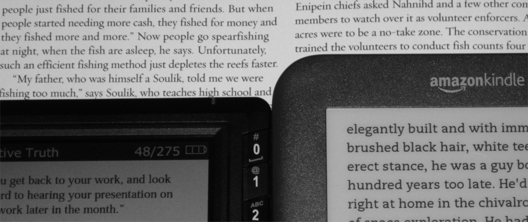 1) The K3, lower right in the picture, is slightly better in contrast than a printed page (top)! Both are better than the jetBook (lower left). That being said, the jetBook's contrast is adequate for almost any condition. On the gripping hand, Ectaco had better have a Pearl version of the jetBook in the plan, or they'll lose out. 1a) The K3 is more pleasing in lower light. [Thwack!] "Don't read in dim light, you'll ruin your eyes, stupid!"--Mom 2) The wireless purchase feature on the K3, which I thought would be a big plus, really isn't that big a deal. It saves a cable attach step. I tend to purchase my books on my laptop, just because you can see more. It's still a plus, but not a big one. 3) The 6" plus keyboard form-factor of the K3 is an annoyance. I prefer the smaller 5"/no-keyboard form of the jetBook. It's not a big difference, but it's there. 4) Control placement for normal functions on the jetBook is much better thought-out. The K3's paging controls are adequate, but nothing to write home about. The keyboard is probably responsible for part of this. The jetBook still excels in this area. 5) Format flexibility is jetBook's win, hand's down. And yes, I know how to convert file formats. The point is I shouldn't have to. These are commercial consumer devices. They're supposed to be idiot-proof. In this respect, jetBook, yes; K3 no. To be fair, I haven't exercised all of the K3 ecosystem's capabilities in this area. With the jetBook, I don't have to think about it. As yet, it's still a toss up in my mind. HOWEVER, the jetBook had better have a Pearl screen version in the near future, or they won't get many new customers. If Astak manages to get one in their 5" reader, which is the closest in functionality to the jetBook, my jetBook might just wind up on eBay. Regards, Jack Tingle |