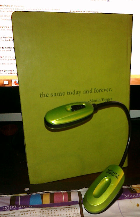 Testing...aha!! Ok, that's how you do it. New cover for my Sony!! I have been drooling over this for months - it's the Tupper Quote cover in Leaf...originally designed for the nook, as you can probably see. But other than the Sony being a tad too short, it works great... and the Sony doesn't move...even if you turn it upside down and shake it. I know, because I did just exactly that. I kind of like the extra room at the top, too..gives me a place to clip the light without having to clip it to the Sony itself.