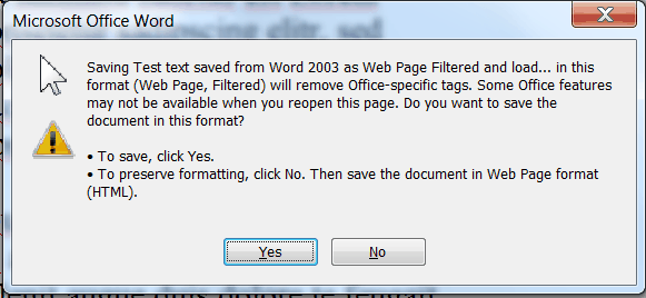 I did, this morning, load the full version of my original problem book into iBooks for the first time. Damned thing behaved perfectly! Yet the exact same file still has the fonts/font scaling issues I've been talking about, in Kobo and Stanza. Let me know what you make of the trial file that's attached to this post. Incidentally, I answered 'Yes' in the dialogue box that came up in Word 2003 when I saved as Web Page Filtered. This dialgue is also attached to this post. I'll have a go at your initial ‘save from Word as RTF’ suggestion this afternoon. |