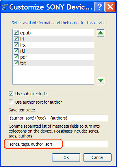 Create a plugboard Format: device_db Device: PRS505 Source template: {series:re(([^\s])[^\s]+(\s|$),\1)}{series_index:0<2s| - | - }{title} Destination: Title This would produce for your example of a few posts back: Series: Meg Langslow Mysteries Series index:3 Title: Revenge of the Wrought-Iron Flamingos Title on Sony: MLM - 03 - Revenge of the Wrought-Iron Flamingos |
