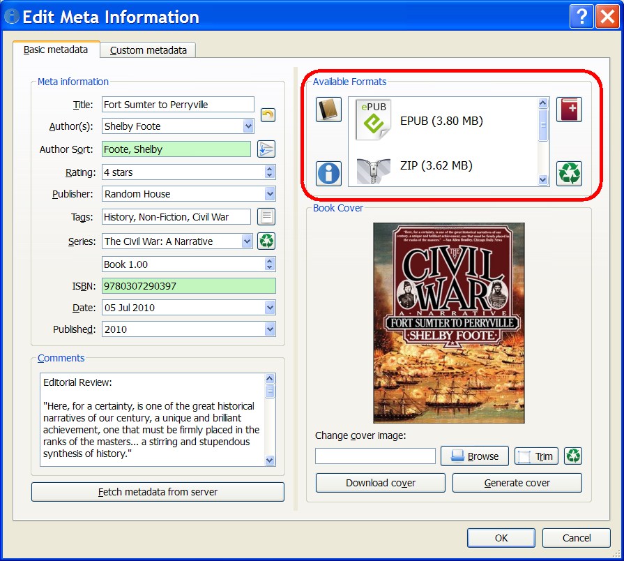 When you select it what formats exist for this book? To find the formats select the book and click edit metadata and tell me what you see in available formats area (see attached). What format is the book you try to add? When you select the book and say remove is the entry deleted? Did you reboot your computer and try to remove the book? Last edited by DoctorOhh; 10-30-2010 at 07:06 AM. |
