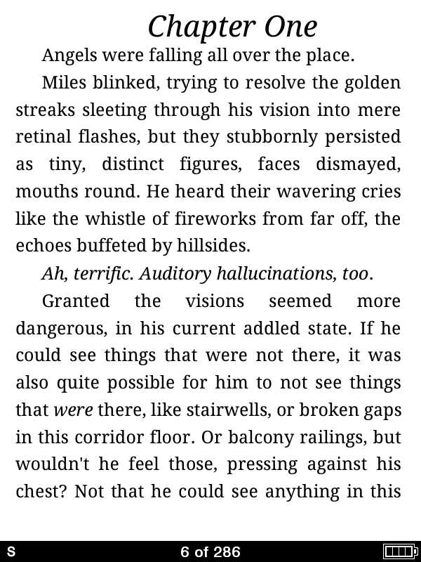 I probably should have thought twice, having the 350-which-has-no-SD-slot-for-recovery, but I was recklessly bold and it worked well enough for me. I love being able to change the default font whilst letting EPUBs keep their embedded fonts (if they have any), the screenshot feature, and the customisable button functions. After experimenting with a lot of serif fonts, I've settled currently on Droid Serif, though I think I'll switch between Georgia and Fontin occasionally.1st: Droid Serif 2nd: Fontin 3rd: Georgia Last edited by viviena; 11-05-2010 at 08:46 AM. |