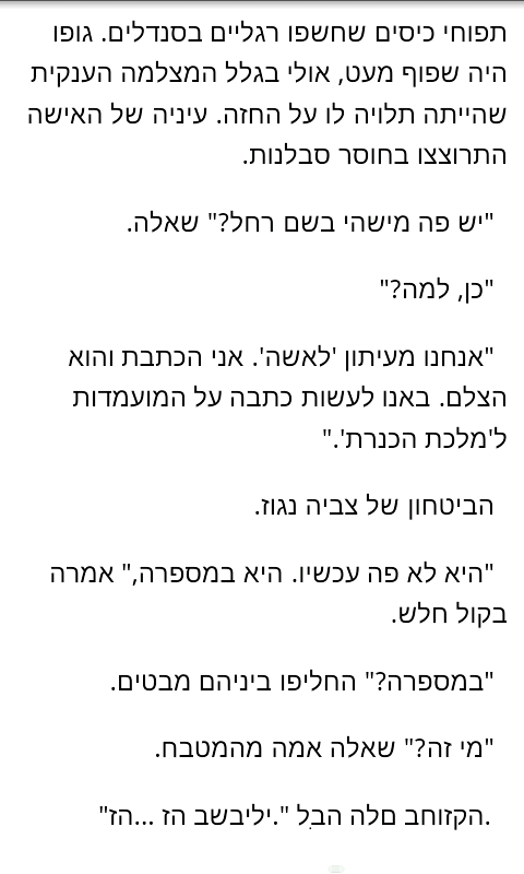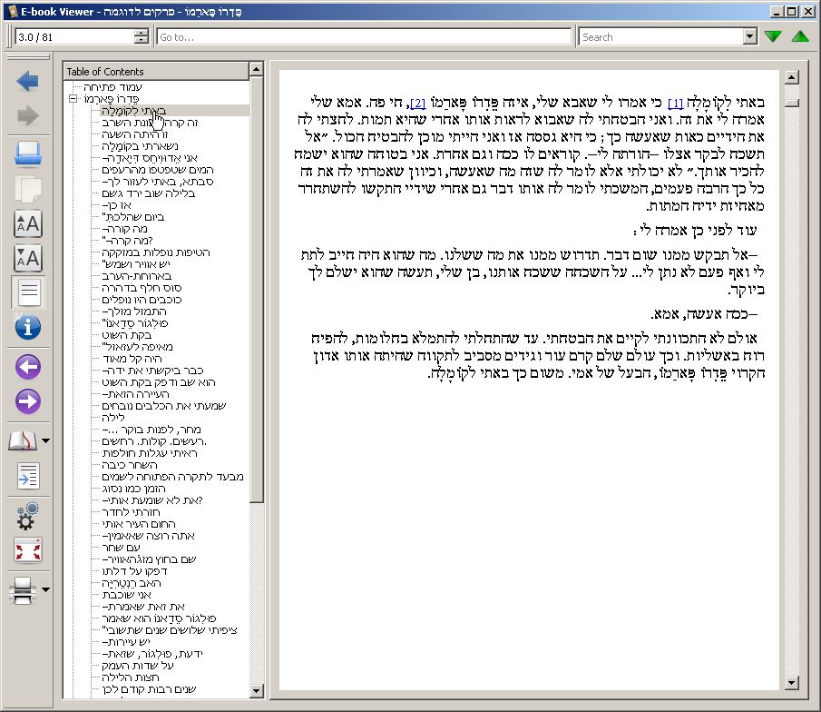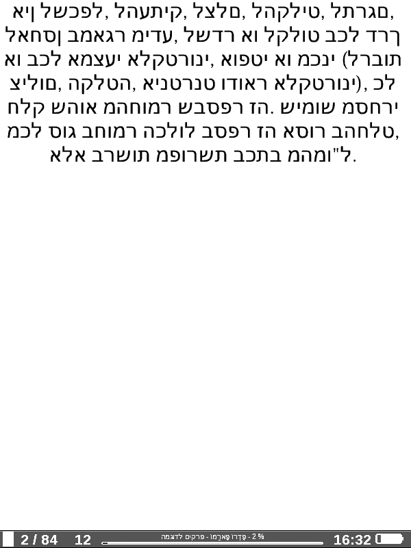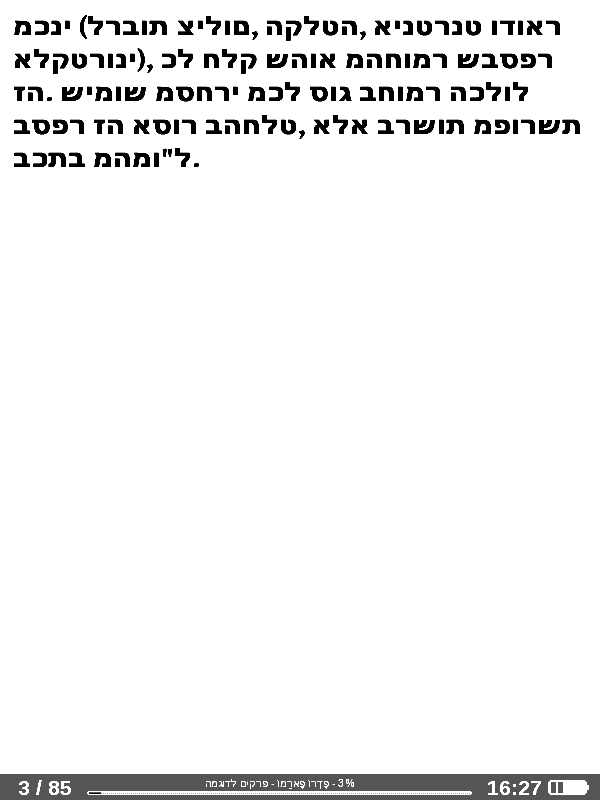 Finally, the Hebrew eBook market shows some signs of awakening. Unfortunately, not all reading systems (eReader devices and applications) support Hebrew properly. Hebrew is a Right To Left (RTL) language (like Arabic) and therefore needs a little different treatment. I would like to post in this thread the current status of Hebrew support among various eReaders, reading applications and platforms. I'll try to update it from time to time. If you have a device that is not listed here, you are welcome to check and post the results. My main focus is on the ePub format. However, I also tested Kindle with mobi ebook... Sample Hebrew ePub is attached here as well as a few screen captures of the expected results as seen with Calibre. In addition, any test results for applications and devices listed here are linked to the appropriate post in this thread. Just the latest and up to date result is linked. eReader Devices and applications that support Hebrew Dedicated e-ink eReaders: 1) Amazon Kindle (3rd generation and above) - kneidlach site 2) PocketBook devices (using FBreader) - Test Results 3) eVrit - a dedicated Hebrew eReader based on Qisda QD060B00 4) PAGEone by Next Papyrus - a Korean eReader, possibly with a firmware update for the Israeli market - Test results. 5) Rooted Nook Simple Touch with Android reading app that supports Hebrew. 6) Rooted Sony PRS-T1 with Android reading app that supports Hebrew. - See details 7) Onyx Boox X61S (using FBReader) with a dedicated (Polish) firmware - Test results 8) Spring Design Alex (possibly with a firmware update by Newpan for the Israeli market ). Tablets and smartphones: 1) iPad, iPhone, iPod (using Stanza or iBooks) - Test results 2) Samsung Galaxy Tab, Motorola XOOM and any other Android Tablet using a capable reading application. Applications: 1) EPUBReader add on for Firefox 2) Calibre (On PC or Mac) 3) FBReader (On PC) 4) AZARDI 6 (On PC, Mac and Linux) - Test Results 5) Aldiko for Android up to Version 1.2 only!!! - Test results 6) Moon+ Reader for Android - Test results 7) OverDrive Media Console (On iOS, Android and Blackberry) 8) Blio Reader for Android. 9) Kobo Reader for Android. 10) Readium extension for Chrome - Test results 11) eBook Reader widget for Opera 12) Bookworm 13) BookGlutton eReader Devices and applications that doesn't support Hebrew ![]() 1) Adobe Digital Editions - Test results 2) Sony Readers - Test results 3) Nook Readers - Test results 4) Kobo Readers - Test results 5) FBReaderJ for Android - Test results 6) Kindle (before the third generation while using valid Hebrew mobi file) 7) BeBook - Test results 8) Foxit eSlick 9) Freda for Windows Mobile 10) iRex 11) JetBook 12) Alex 13) CyBook by Bookeen 14) Aluratek eReaders 15) Aldiko version 2 Below are sample screen captures of valid Hebrew display of the attached ePub: TZR-PedroParamo.epub TZR-PedroParamo.epub Last edited by carmelra; 05-13-2013 at 04:43 PM. Reason: Kindle Hebrew support officially added. |