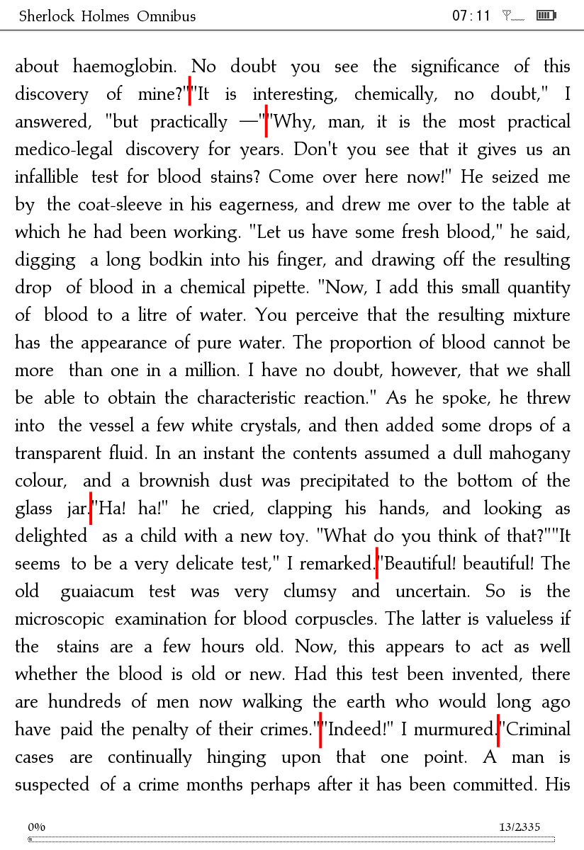 The bug list is rather large that I have come up with, if you want to send it to them go ahead: - Links have incorrect leading and trailing spaces: Also available on Feedbooks forThe Trial(1925) Also available on Feedbooks for The Trial (1925) - Word documents (.doc) are converted EVERY time you open them, do not save place in book if you open them again, have to find place in book manually. - Table of content links in mobi/epub crash the reader or do not work. - Quotations are not attached to words, and end on the ends of lines like this: this is the end of line one " this is the start" of line two - Epubs miss returns/newlines, so text runs together (newline is replaced by space). - Center text on epub has text overlayed on top of it. It should have a newline after it. - Reader does not support the 10 european ISO 8859 charsets, so special characters do not show up. Workaround is needed, possible conversion to UTF-8? - Using dictionary definition, pressing Next page causes system crash and reboot with some definitions. [QUOTE=curstpriest;1215831] Thanks for the bugs list. I cannot reproduce your problem with table of contents. Mine works perfectly. Also, my dictionary page turns works perfectly. It is different from Kindle, in that, after moving cursor to a word, and dictionary pops up, you then push "enter". After that, pages turn work fine. |