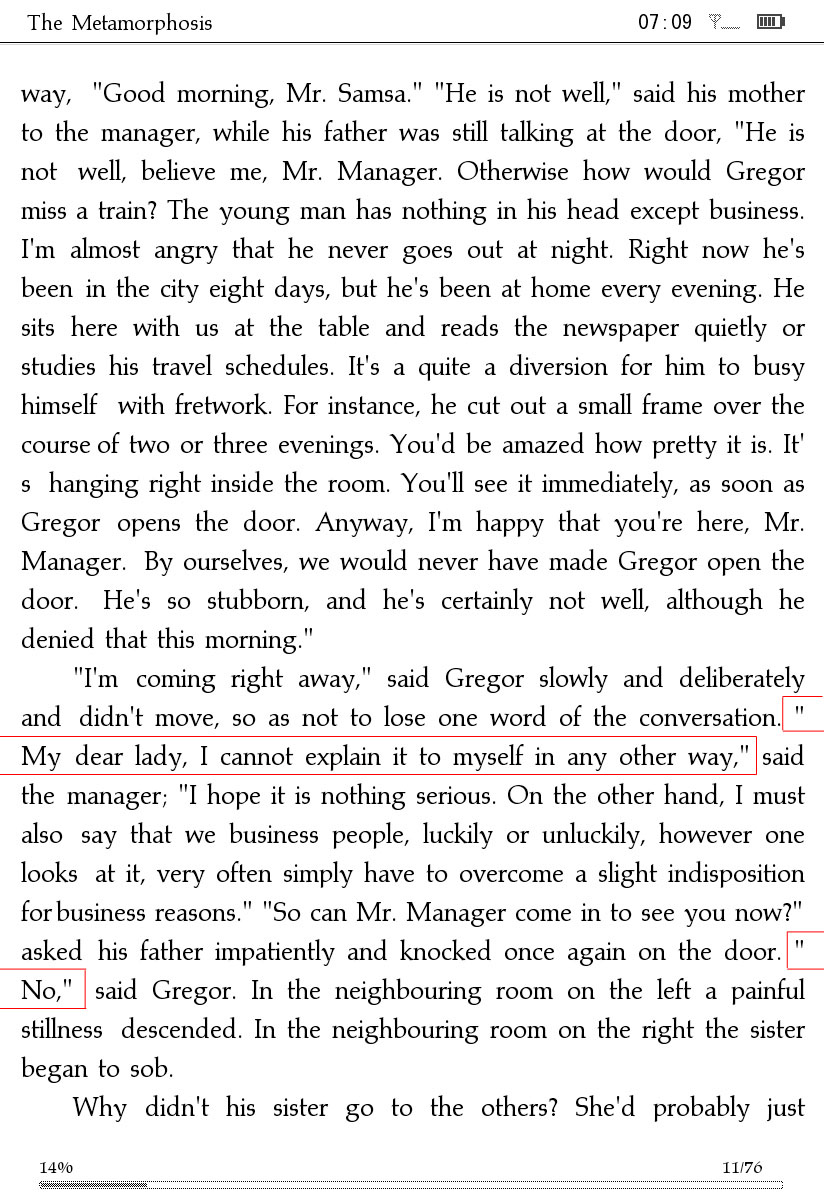 Also, I think the reader uses UTF-8 for all character encoding. This makes sense, as it does away with the ISO 8859 charsets. The only problem is that you need an step between ISO 8859 -> UTF-8 to get the document to show up properly, and I don't think duokan is doing this right now. So either convert all of your documents to UTF-8 yourself, or wait for duokan team have the reader convert the charset to UTF-8. No idea how they might do this, but it should be easy to accomplish just by loading it into memory on the fly, or at the very least, by copying the book to memory (/tmp) and converting it there. Anyways it's nice that they are working on english translation bugs, and are working on an uninstall utility. The bug list is rather large that I have come up with, if you want to send it to them go ahead: - Links have incorrect leading and trailing spaces: Also available on Feedbooks forThe Trial(1925) Also available on Feedbooks for The Trial (1925) - Word documents (.doc) are converted EVERY time you open them, do not save place in book if you open them again, have to find place in book manually. - Table of content links in mobi/epub crash the reader or do not work. - Quotations are not attached to words, and end on the ends of lines like this: this is the end of line one " this is the start" of line two - Epubs miss returns/newlines, so text runs together (newline is replaced by space). - Center text on epub has text overlayed on top of it. It should have a newline after it. - Reader does not support the 10 european ISO 8859 charsets, so special characters do not show up. Workaround is needed, possible conversion to UTF-8? - Using dictionary definition, pressing Next page causes system crash and reboot with some definitions. Feature Request: Font for SYSTEM/MENU + Font SIZE for system + menu will prevent truncation of text and make menu formatting stay clear for translations Source files: The Metamorphasis MOBI Sherlock Holmes Omnibus EPUB Last edited by curstpriest; 11-14-2010 at 11:41 AM. |