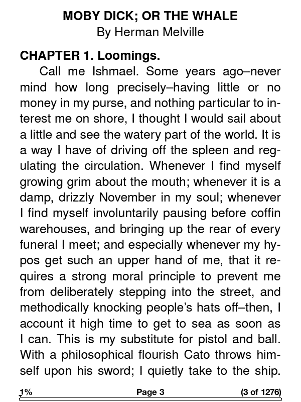 Be that as it may, I've spent a lot of time thinking about the Kindle, and more importantly, thinking about PDF's, formatting, and all that kind of goodness. I've been a long time lover of the LaTex typesetting system, and after digging around in Google, I found some people who had been playing around with using LaTex to lay out text an save in a Kindle usable (so reflow wouldnt be an issue). Returning from lunch, I found myself 3 hours from getting my Kindle, so I thought I would play around with using LaTex. If anyone is home right now, and has their Kindle nearby (non-dx) and would like to download this PDF I made using the Project Gutenberg Moby Dick txt, I'd love to hear how it looks. Click here to download. For those interested in the LaTex code I used, it's below. I'm planning on looking at this myself when I get home, but I'm feeling a bit impatient. Code: