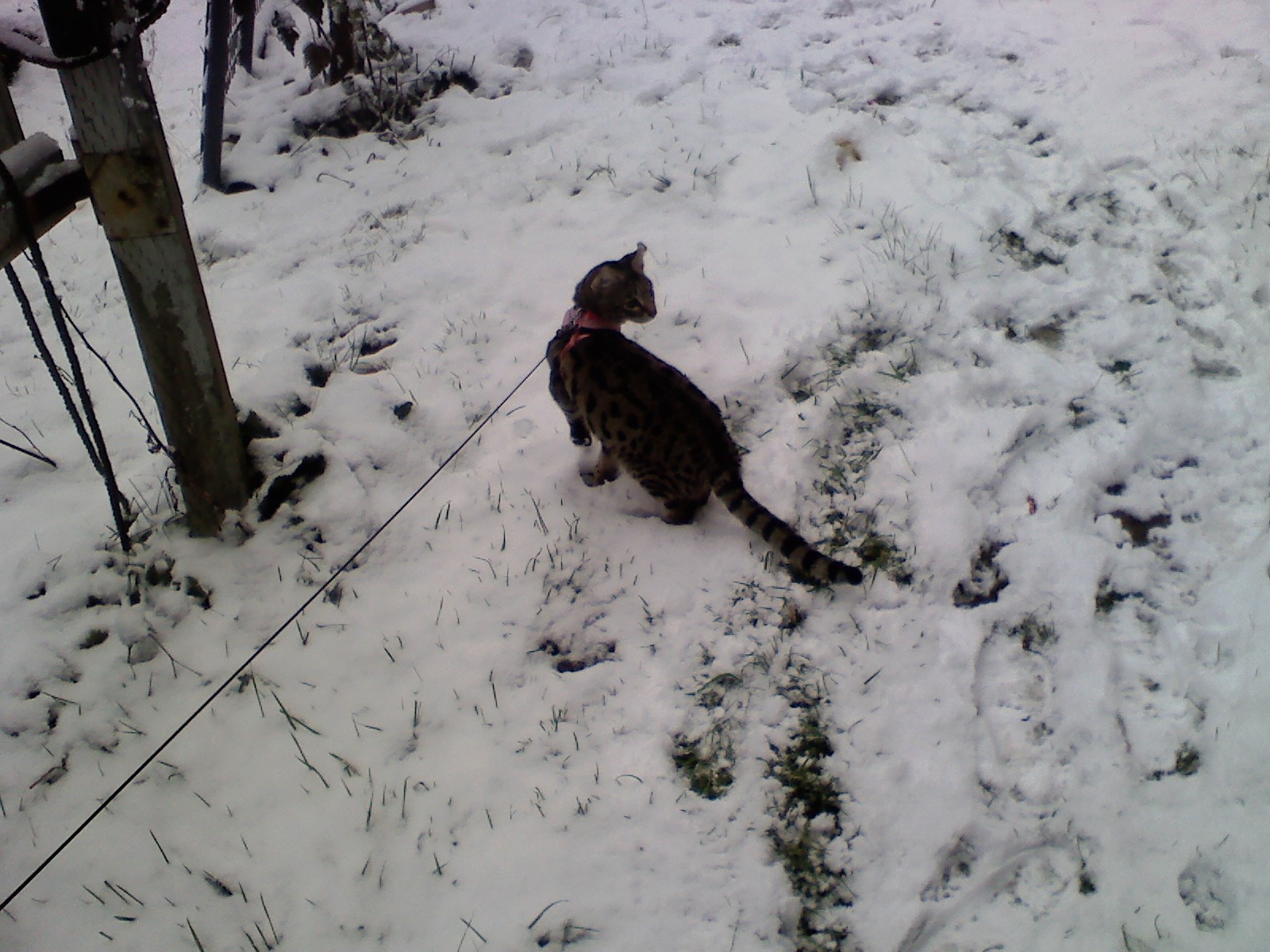 he's doing pretty darn well. I was fairly confident that he would not go to far afield in the snow and cold. indeed, he set the timing of our return inside. all of a sudden he just turned and headed for the door. during the summer when I was working in the garden I would let him trail his leash behind him knowing I could catch the leash or it would get hung up on something if he decided to take off. Arwen now, has much stronger butterfly tendencies. she needs to be secured, or dragging something fairly heavy that slows her down