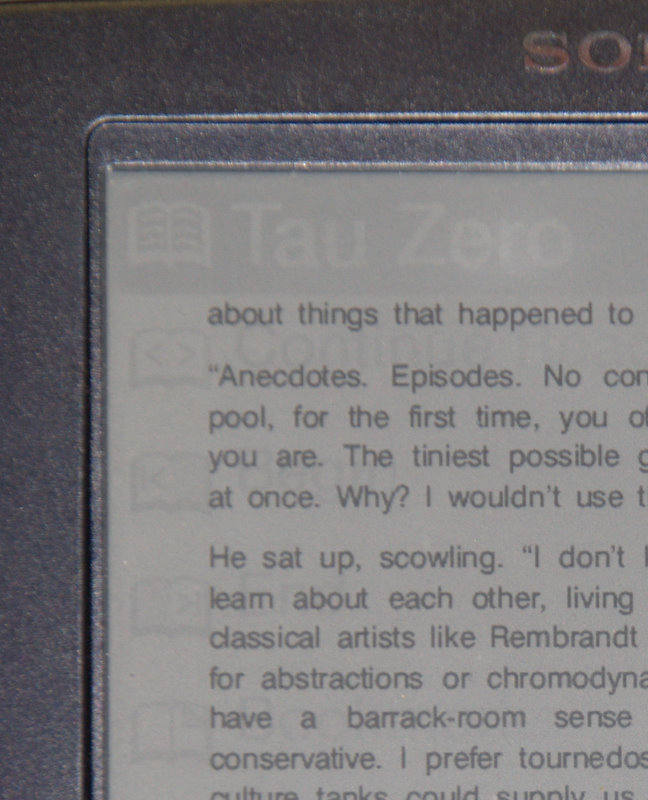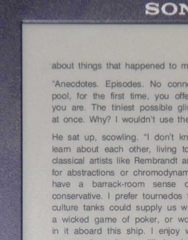 I've been reading this thread with interest. I have owned a PRS-500 nearly since its release, and just upgraded to the 505 (after the Kindle announcement, so I knew what I was doing). For me, book reading is an immersive experience. I don't want any device to distract me from the altered state I achieve in a book. Paper books themselves can distract, if they are not printed well, or are improperly sized for the content, etc. While I loved the technical properties and the aesthetic of the PRS-500, I found a couple of things that made it a constant distraction. First was the contrast issue. It was just too hard to read unless I got the light just so. Of course, daylight was wonderful, but I don't usually read outdoors. (Nature being one of those unwanted distractions I mentioned.) The second issue was the PRS-500's tendency to leave ghost images when the page was turned. To me this was incredibly distracting and annoying. When I first got my hands on the PRS-505 I knew it was the solution for me. Contrast is now high enough that I can read in most places I could read a paper book. The 20% improvement figure does not give a fair representation of the magnitude of the difference between the two products. There is a threshold that was crossed, and that makes the 505 just work. Ghosting is gone too. I have attached comparisons between the 500 and the 505, showing both the contrast and ghosting problem. I do not have a Kindle, so I cannot do a side-by-side comparison. But, if the Kindle does not have the contrast and lack of ghosting of the 505, it is not for me. I've also puzzled over the complaint on this thread about a replaceable battery. The battery lasts so long on the Sony (either one) that it is just not a factor in its use. I eventually get back to a power supply, and can charge it. Of course, with the Kindle, power is much more of an issue. But for the Sony, the battery is one of those things that just doesn't distract. (I don't worry about termites with my paper books either. )To the poster who said they needed the ability to make an impulse buy (citing impulses received in the bathroom, of all places) I just have to state that this doesn't seem like a practical limit in general use. As I said before, when I read, I want to be immersed. Impulses have no place there. The Kindle, with its plethora of options (browse the bookstore, Wikipedia, etc.), itself becomes a distraction. I don't even have to mention how distracting an undesirable page turn is to me. The Kindle loses on this front, if other reviews are true (I don't have one, I can't say for myself.) To each his own, but for me, I'll stick with the Sony. Last edited by chuck94022; 12-03-2007 at 08:25 PM. Reason: attach images that didn't appear inline |