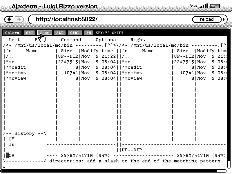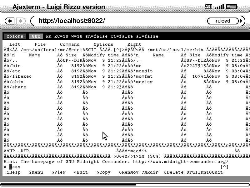 I successfully compiled Midnight Commander for kindle :-). From ssh it's good. Encoding is ok and mouse is working too. On AjaxTerm is bad encoding (I can rebuild it with ISO-8859-1, but some encoding switch will be nice - especially for different languages (Default <-> UTF8)). But main problem is missing keys (F1..F12, arrows etc.). How Ajaxterm emulate them? How about add some virtual buttons for 'crtl' and 'function key' (for example with mouse click on 'function key' and on keyboard press Q for F1)