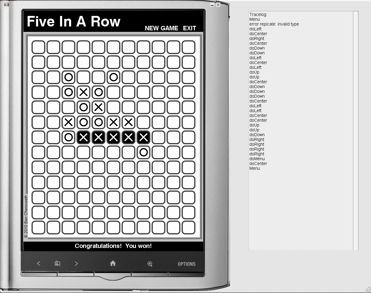 I just loaded Five In A Row onto my 600 (using a custom built PRS+ installer) and the game works fine. Perhaps the buttons are a bit on the small side (I guess there is always the stylus), but it was still very playable. I'm really happy! Much thanks to you and Kartu! |