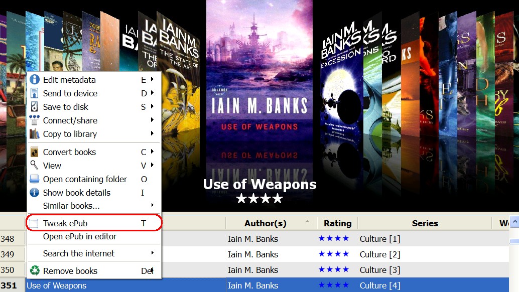 The tweak epub feature is in the right-click menu for any given book, or just press the letter 't' on your keyboard.