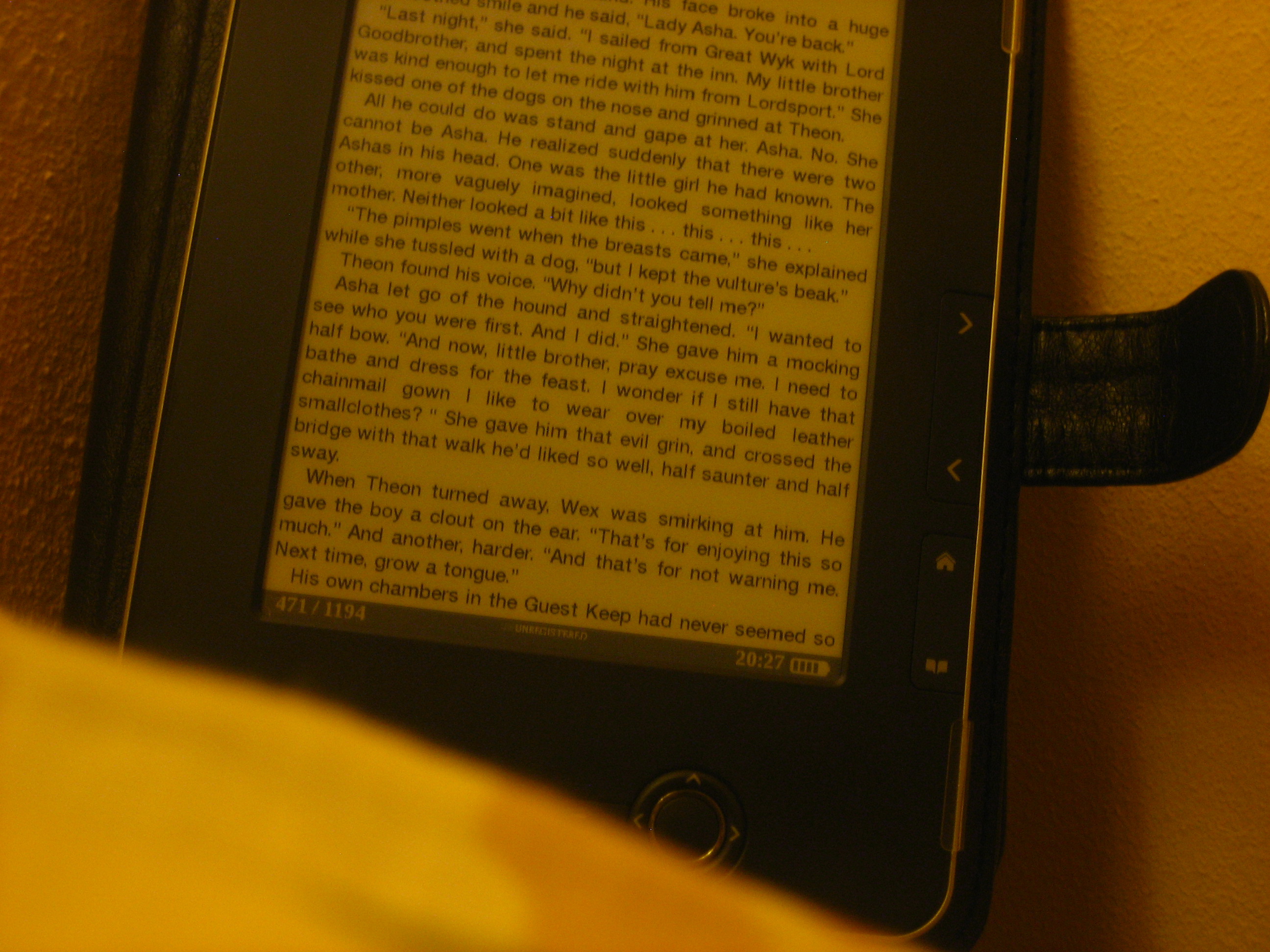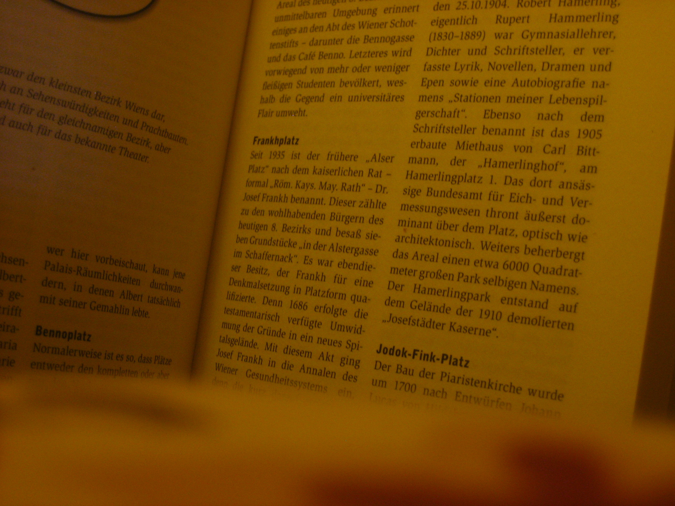 Ich hatte zuerst einen PB360, hab ihn zerstört und kaufte mir dann einen Kindle 3, den hab' ich ver-ebayt, weil es mich die Software gezipft hat, dann hab' ich den PB IQ versucht, weil ich sowieso fast nur Abends oder Nachts lese. Aber den TFT Schirm hab' ich echt unterschätzt, da hats mir die Augen rausgefetzt , deshalb hab' ich ihn zurückgegeben und jetzt den 602. Schon mal vorab, ich werde ihn behalten bis eine neue Technologie rauskommt (vl Mirasol oder so).Zum Review: Ich werde versuchen hauptsächlich jene Punkte anzusprechen die für die Hauptverwendung (nämlich lesen) ausschlaggebend sind und, wenn ich vergleiche, hauptsächlich den Kindle 3 ansprechen, weil der in meinen Augen momentan einfach ziemlich Top ist und ihn mien Kumpel zum Testen direkt neben meinen legen konnte. Gut Punkt 1: Der Display. Ist ja ein Vizplex und es gab gaaanz viel Diskussion bzgl. Qualität und ob er an den Pearl ranreicht. Das war auch für mich eines der Hauptkriterien, deswegen hab' ich folgendes gemacht: Ich hab' am 602 die gleiche Schriftart installiert, die auch der Kindle verwendet um einfach mal die gleiche Textstelle direkt vergleichen zu können. Mein Urteil: Hätte es nicht gedacht, aber ich hab' eigentlich keinen groben Unterschied in dem Gesamterscheinungsbild feststellen können. Folgende "Eigenschaften" sind mir aufgefallen: - die Schrift des 602 Screens ist um einen Tick weniger schwarz als vom K3, aber wirklich nur ganz marginal - Der Hintergrund vom 602 ist viel gelbstichiger als der Pearl, der hat eher einen grauen Einschlag. Ich hab' lieber den Pearl, meine Frau und mein Kumpel (mit dem K3) sagen es ist komplett egal, und eine Freundin sagt sie findet den 602 schöner, weil er "wärmer" aussieht. Alle waren sich einig, dass es kleine Unterschiede sind. - Wenn man die Lichtquelle direkt im Gerät spiegeln lässt, kommt der 602 etwas besser weg (der nichtlesbare Teil ist kleiner als beim K3). Ich hab' euch das fotografiert (oder zumindest versucht). Die Bilder sind in echt schummrigem Licht gemacht und zum Vergleich das letzte Bild von einem echten Buch. --> Display Fazit: Tip top, vielleicht einen kleinen Tick schlechter als der Pearl, aber wirklich nur sehr wenig. Wenn jemand sagt dass er auf dem Screen nicht lesen kann, dann würde ich stark zu Hörbüchern raten, viel besser wirds wohl nicht mehr werden. Punkt 2: Haptik. Da kann ich mich kurz halten. Das Gerät liegt gut in der Hand, schaut schön aus (besser als der K3 finde ich), ist schön leicht und knarzt nicht wenn man es angreift. Einzig den 4-Way Button finde ich eine Spur zu tief eingelassen, und mit zu hartem Druckpunkt. Die 4 Seitenknöpfe sind genau super, ich nehme an der 4-way muss halt robuster sein. Stört nicht wirklich. --> Haptik Fazit: Gute Verarbeitung Hardwareseitig, 4-way Button könnte etwas besser werden. Punkt 3: Datei-Formate Was wirklich nett ist ist, dass mobi Dateien (Die ich ja am Kindle brauchte) einfach 1:1 gelesen werden. Das ist schon spitze. Sonst les ich hauptsächlich epups und PDF's, dazu aber mehr in der Software. --> Fazit Formate: Es wird alles unterstützt was man so braucht und wenns nicht dabei ist, gibts immer noch Calibre. Dem hab' ich gleich mal 10 Euro gesponsort hehe. Punkt 4: Geschindigkeit Also da haperts noch ziemlich. Ich weiß auch nicht, ob man das auf die Firmware schieben kann, ich fürchte nicht. Der PB360 war nämlich genauso lahm. Das Blättern selbst ist leicht schnell genug, das ist nicht so tragisch. Aber die restliche Software (z.B. schon das Menü direkt beim Lesen) reagiert wirklich sehr schleppend. Beispiel: Will man während dem Lesen die Sprachsynthese umstellen (auf eine andere Sprache), dann dauert das ca 30 Sekunden (Hauptmenü->Einstellungen->Sprachsynthese->umstellen->auptmenü->Buch). das ist schon ganz ordentlich, aber gut, so oft stellt man so zeug ja auch nicht ein --> Fazit Geschwindigkeit: Nicht sehr toll, egal was man macht. Vielleicht Tweaken sie da noch in der neuen Firmware, bin aber skeptisch. Punkt 5: Verschiedenes Und hier ein paar generelle Sachen die mich teilweise sehr gestört oder gefallen haben: - Die Einstellungen sind manchmal inkonsistent. Was heisst das jetzt Also ich lese z.B. ein epub, dann kann ich mich entscheiden: Les ich es mit dem Adobe Reader, dann hab' ich eine Prozentanzeige, dafür kann ich die Schriftart nicht umstellen und beim Einschalten kann nicht die letzte gelesene Seite angezeigt werden. Mit dem FbReader sind gibt es eine Einstellungsseite (direkt im Buch) in dem man Schriftbild usw einstellen kann, dafür gibt es nur eine Seitenanzeige (und keine %).-Wenn man "beim Einschalten letzte Seite anzeigen" aktiviert, ist das super, dann kann man vor dem ausschalten einfach auf die nächste Seite blättern, und beim Einschalten bootet das Gerät im Hintergrund. das MUSS sein, geht aber nicht im AdobeReader (und damit in allen PDF's und hmm mobi auch glaub ich). - In der Bibliothek gibt es 3 schöne Tabs (File, Bookland und Bibliothek) die zwischen den "organisationsmodellen" umschalten lassen. dazu muss man in der linken Spalte ganz nach oben scrollen. Aber!: Wenn in der linken Spalte viele einträge sind (wie z.b. die ganzen Genres der 1000 vorinstallierten bücher) und man befindet sich (wie ich) gerade bei einem Buch der Sparte Fantasy, dann muss man 45 mal (!) nach oben drücken um wieder in den Tabs zu sein um nach Dateien zu sortieren. Ok das hat jetzt eh keiner Verstanden, aber das nervt unglaublich ![]() - Die Aufforderung das gerät zu registrieren nervt, aber die kommt sicher mit dem nächsten Update weg. -PDF handling ist super, ich lese viele wissenschaftliche Papers, das ist sehr angenehm (auch der extra 2-spalten Modus). - Der Browser ist meiner Meinung nach nicht verwendbar, langsam, man weiss nicht ob was passiert oder nicht, wenn man Knöpfe drückt usw.. - Bluetooth unterstützt kein FTP Service. Schade da hätte man bequem über den Windows explorer kabellos beladen können. Vielleicht kommt das noch