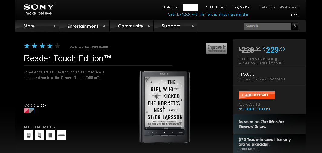 | Sony Reader Touch for $269.99 at Sony Style | tracyeo | Deals and Resources (No Self-Promotion or Affiliate Links) | 0 | 10-13-2009 12:37 PM |